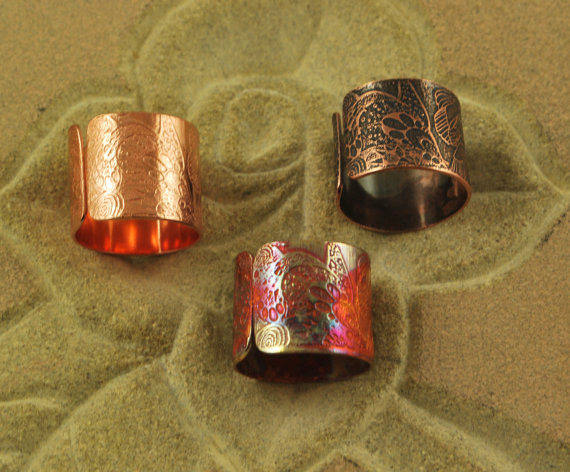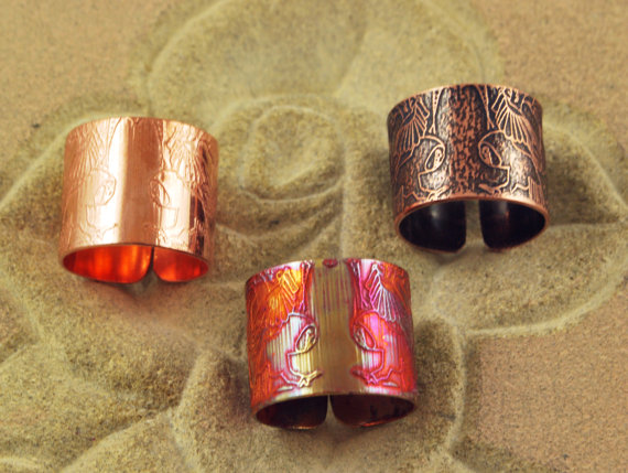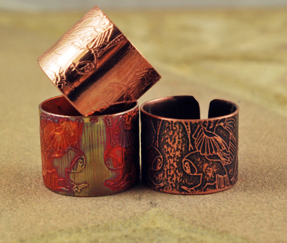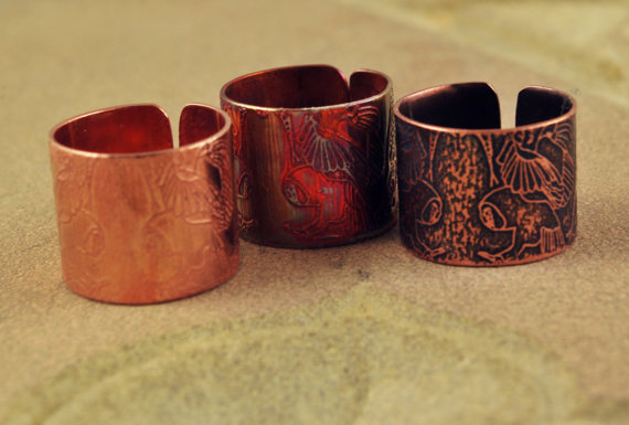 This etched copper ring is etched with a double flying Owl motif. It is open at the back, allowing them to be adjusted to size. The copper is etched using non toxic processes, hand cut and formed using traditional jewellery tools. This etched copper ring can be pinched or stretched to size. It comes in three finishes: natural copper, oxidised (black and copper in appearance) or heat coloured to create a vibrant multicoloured patina: (please note that heat coloured copper rings are designed for occasional wear only, due to the fragility of the patina: if you wish to wear your ring permanently/frequently, I strongly advise choosing a natural or oxidised finish, or choosing from my coloured steel range, which has a extremely durable, permanent finish ) Please indicate your desired finish upon purchase.