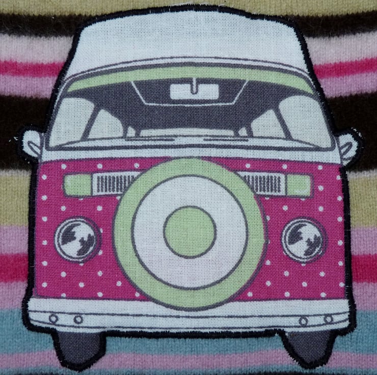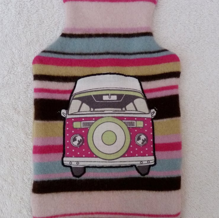 I have designed and created this fabulous VW camper hot water bottle cover from an up-cycled Angora and Cashmere jumper. The van motif is attached with bondaweb, and then machine appliqued with a close zigzag stitch. The cover is an overlapping flap design, so your hot water bottle can be easily inserted.