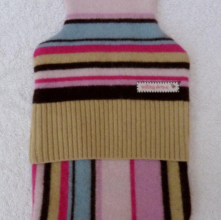 The covers are created from previously loved and recycled jumpers, that I have washed in a hot temperature and pre-shrunk. I have then cut and re-stitched the felted jumper, with all seams being professionally finished with a serger/overlocker, to create this useful hot water bottle cover.