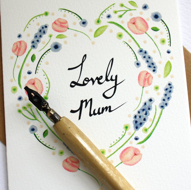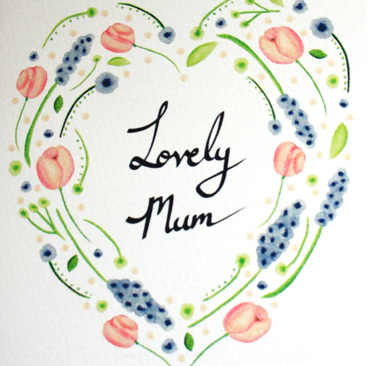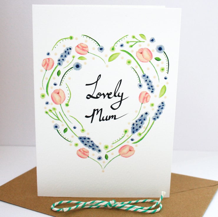 Simple and pretty Lovely mum card, featuring my country garden watercolour illustrated heart and calligraphy lettering 'Lovely mum'