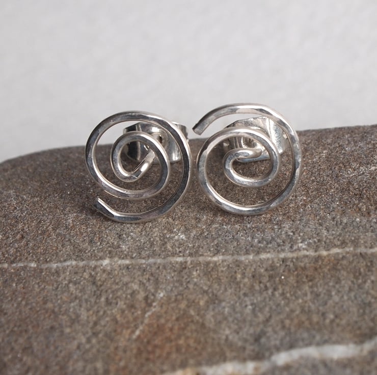 These handmade sterling silver earrings are made in one piece to form a spiral stud earring. They are understated, light, comfortable and modern and have been lightly hammered to add texture and sparkle. The ear wires are approx. 1cm long and they come with silver scroll (butterfly) earring backs.