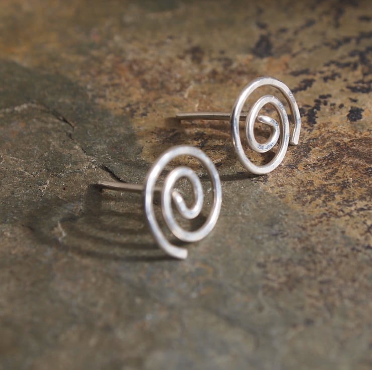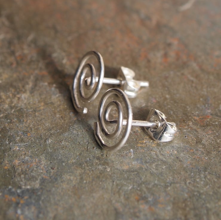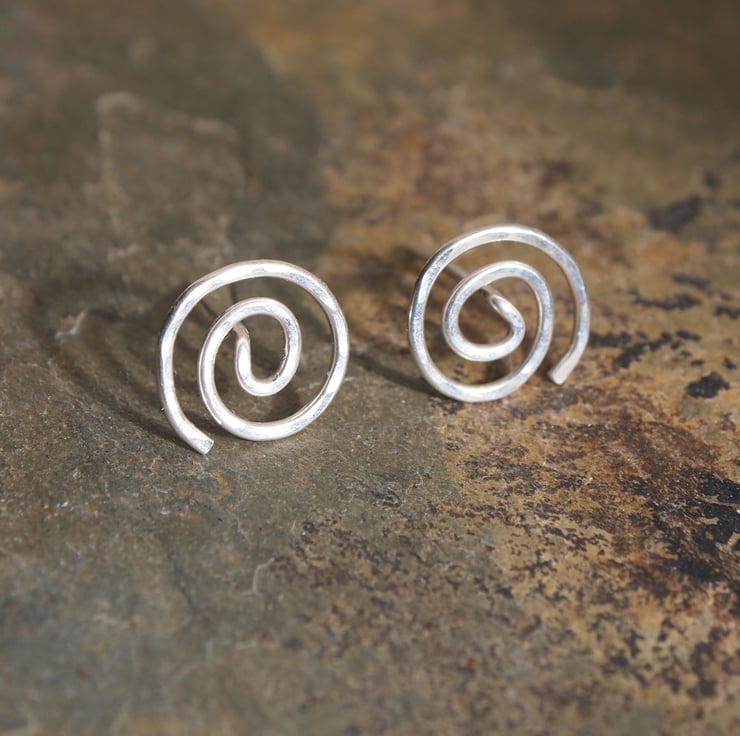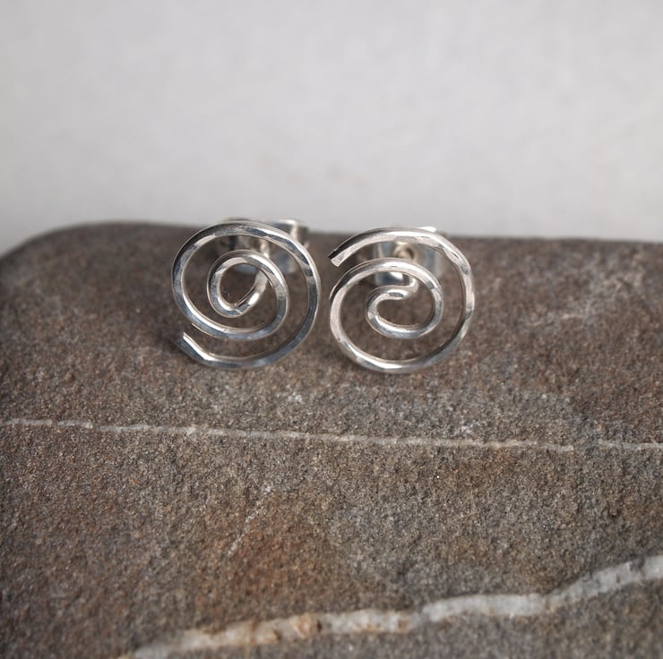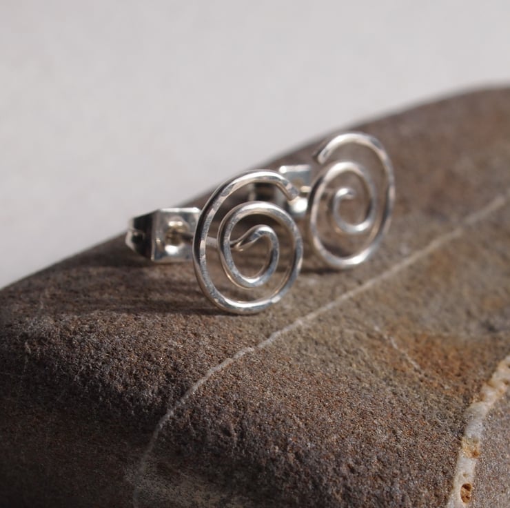 These handmade silver earrings are made in one piece to form a spiral stud earring. They are understated, light, comfortable and modern and have been lightly hammered to add texture and sparkle. The ear wires are approx. 1cm long and they come with silver scroll (butterfly) earring backs.