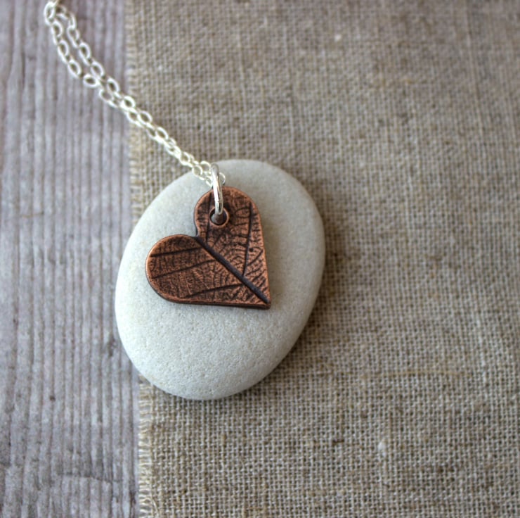 The clay is shaped, then textured using a real skeleton leaf from my garden; dried, sanded smooth and then fired in a kiln. After firing, you're left with a 100% copper pendant, with a lovely, organic texture.