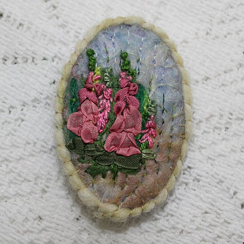 Spikes of foxgloves contrast with the felted background of this embroidered brooch.
