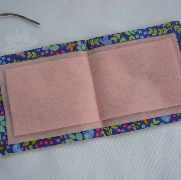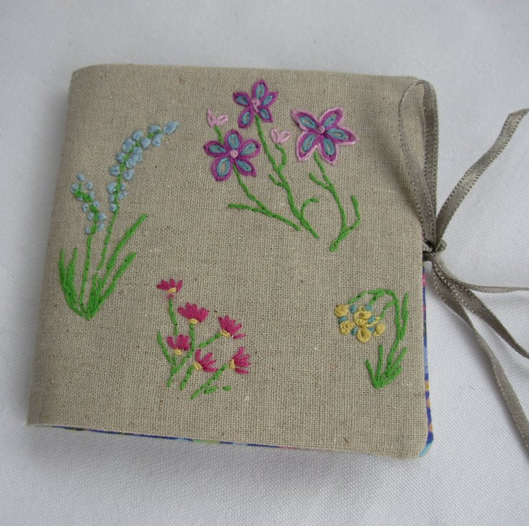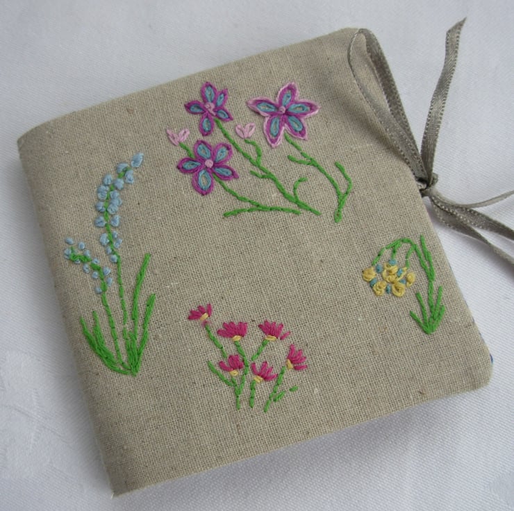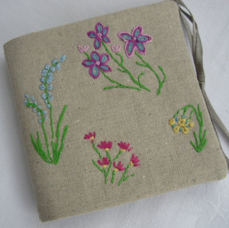 I've made this little sewing needle case in a oatmeal linen outer fabric and a blue floral inner cotton fabric- 4ins (10cm) by 4ins (10cm) - with 4 pink felt leaves for your needles and pins - decorated on the front with blue, yellow, pink and magenta embroidery flowers and green embroidery stems - does up with an oatmeal ribbon tie - all hand cut and sewn to my own design.
