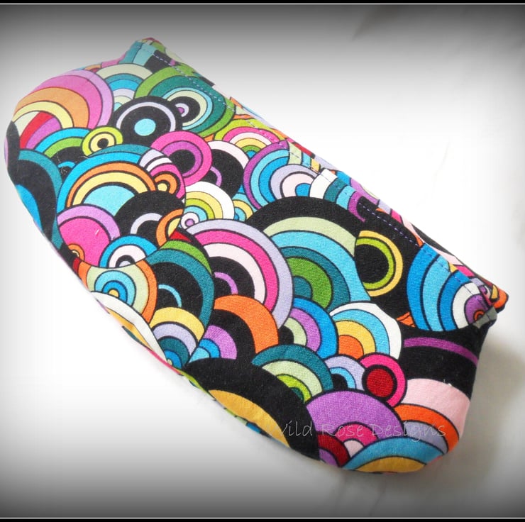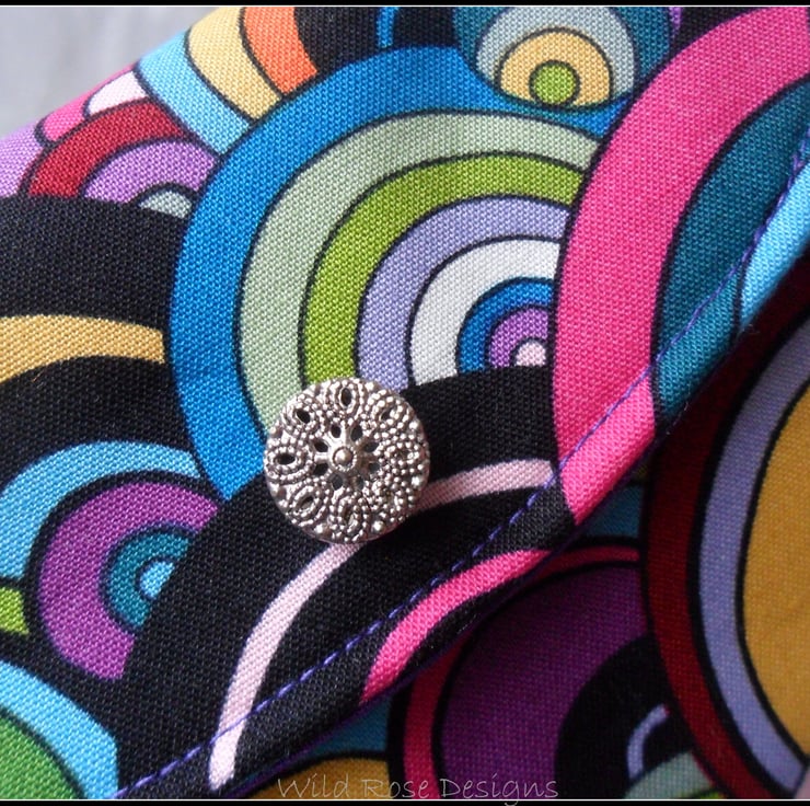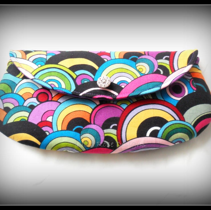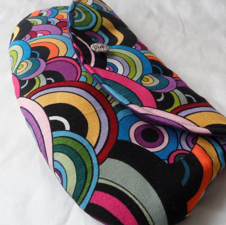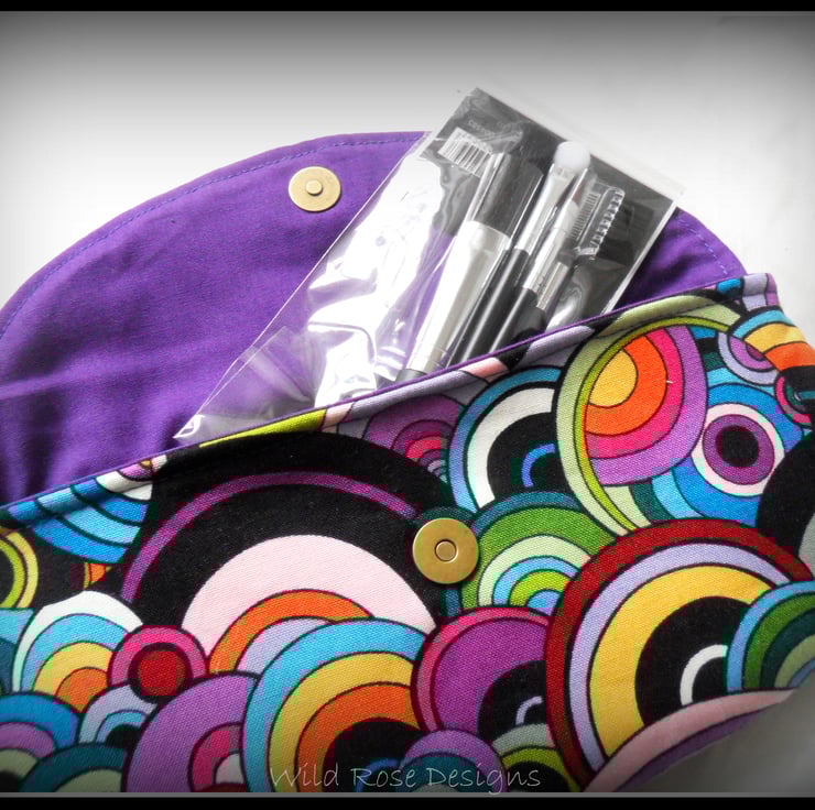 A handmade make-up bag in a fab multi-coloured 60's print cotton and lined in a purple cotton. The flap has a silver tone filigree button and it closes with a small magnetic snap.. The make-up bag measures approximately 23.5 cm x 11 cm (9 1/4" x 4 1/2") and comes with a free set of make-up brushes.