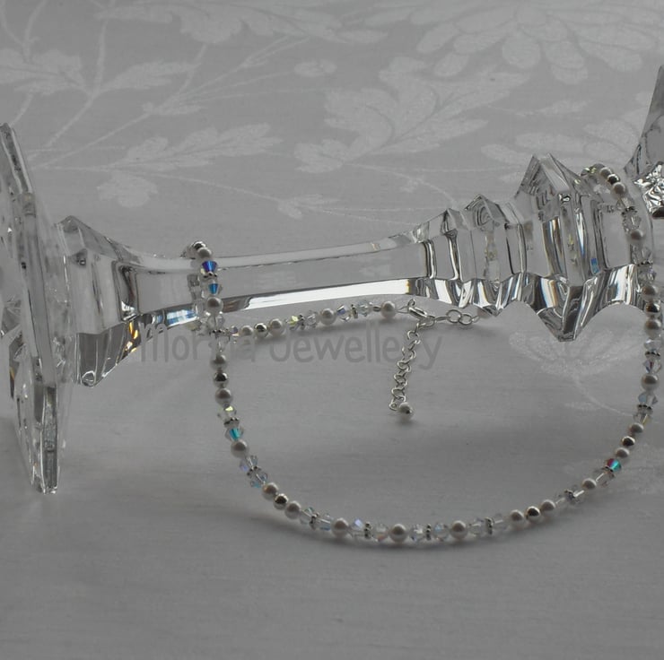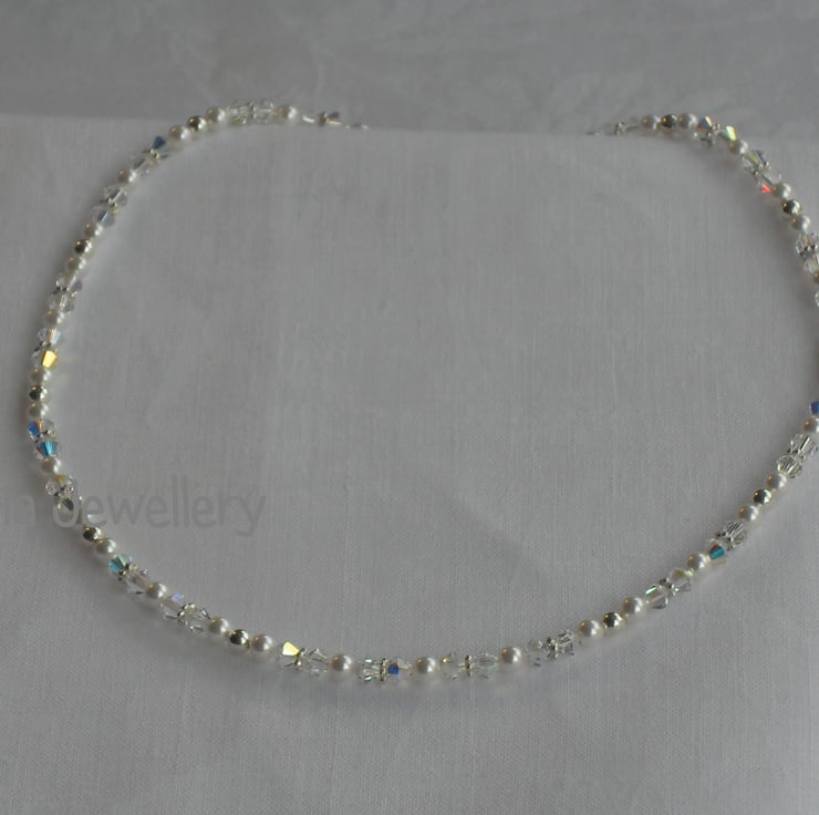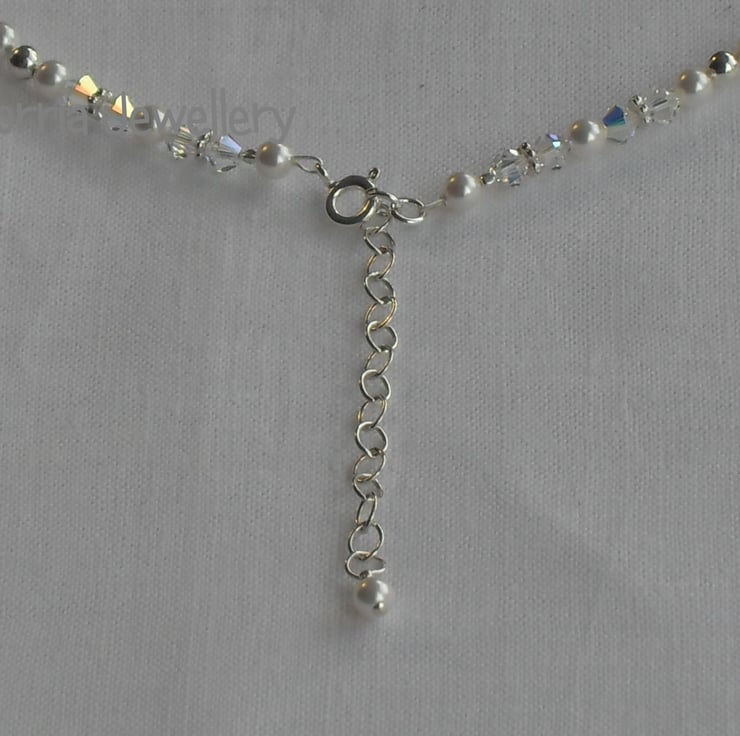 4mm white high end crystal pearls and crystal AB "diamonds" combine with 4mm sterling silver round beads and flower spacers make this very elegant necklace. It is fastened using a sterling silver bolt clasp and extender chain. Overall length 40.5cm to 44.5cm (16 to 17.5inches)