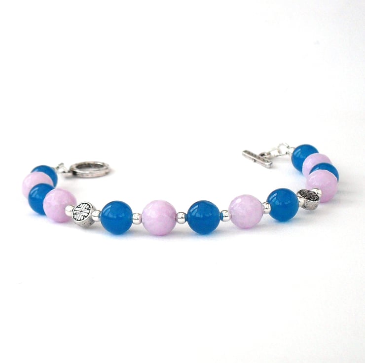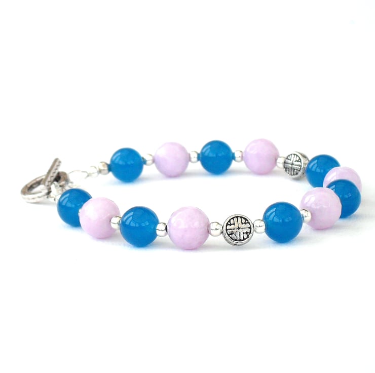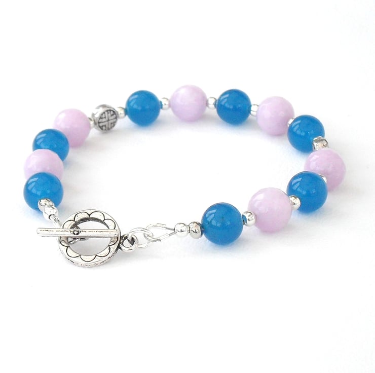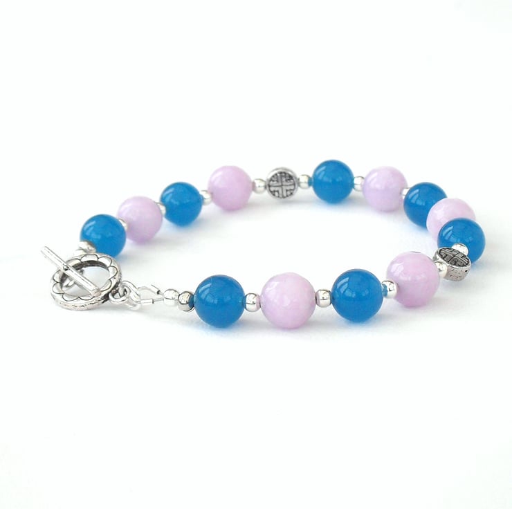 Delicate pale lavender jade 8 mm beads look great with stunning blue apatite and decorative tibetan silver beads. They are separated by small silver coloured beads in this one-of-a-kind handmade bracelet.