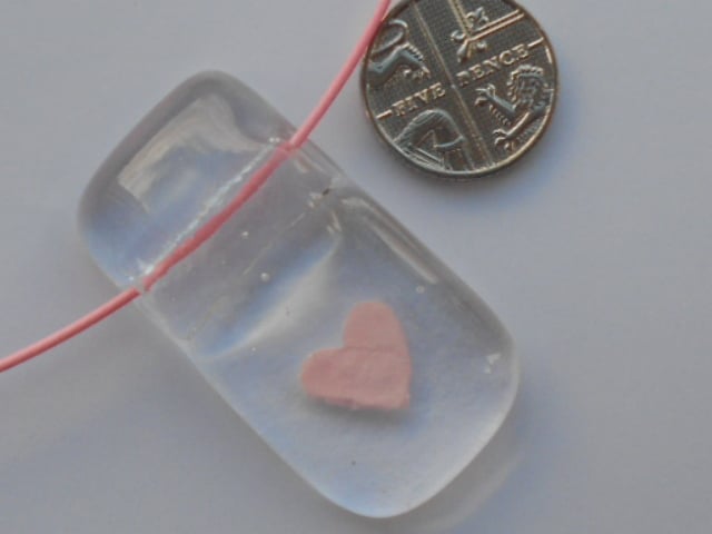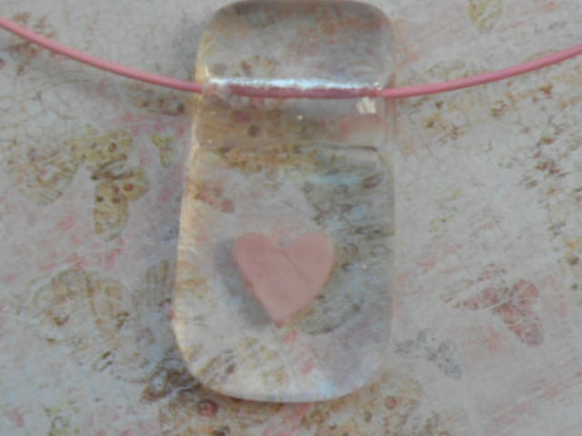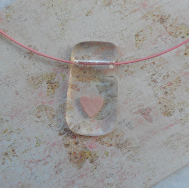 A tiny pink heart fused between two layers of fused glass. The pendant hangs from a pink memory wire choker which fastens securely with a screw clasp. The pendant measures approximately 4cms x 2 cms x 0.5cms and the choker is approximatey 45cms.