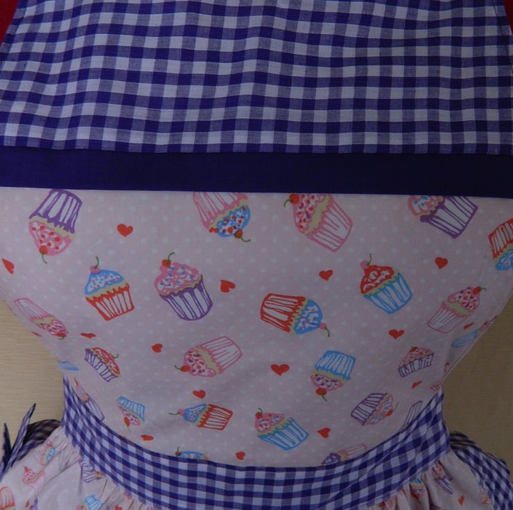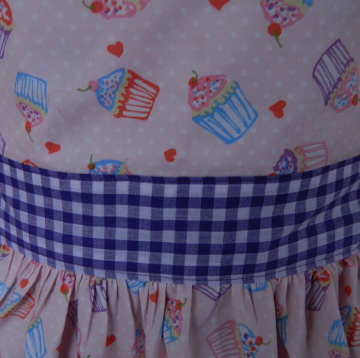 Here we have a lovely cotton rich pale pink polka dot with cupcakes and a lilac gingham trim retro style apron, handmade in house to our own design. (see photos). Adjustable neck and waist ties so will fit up to a size 22.