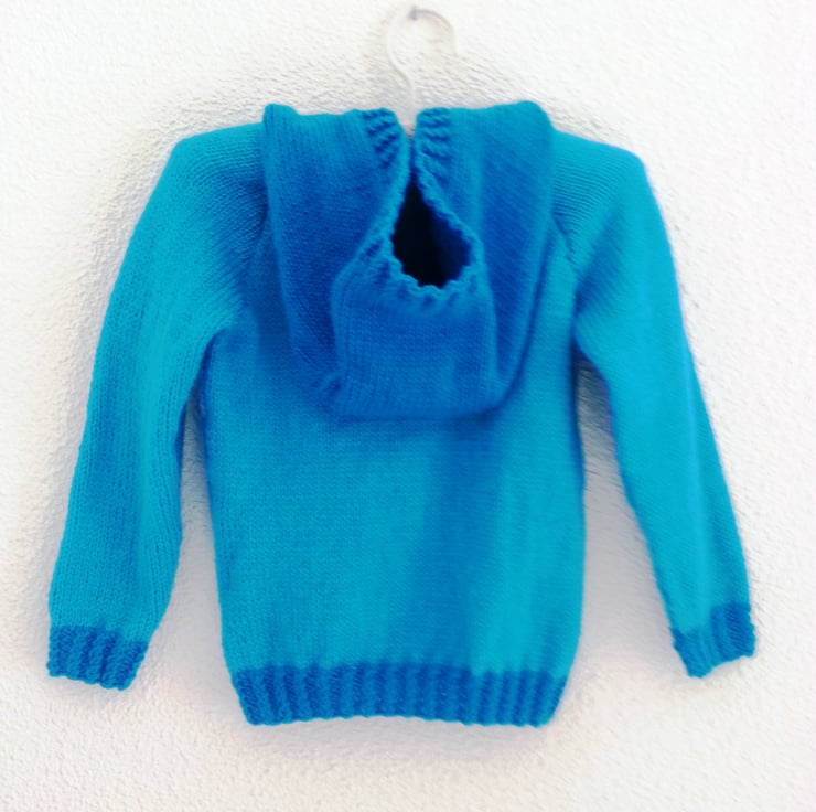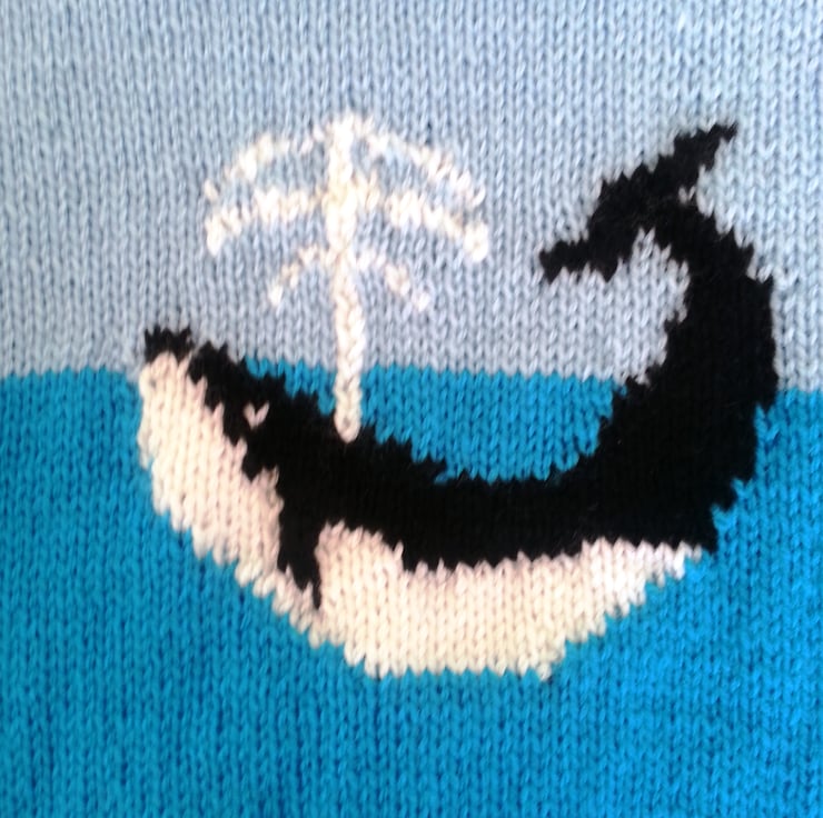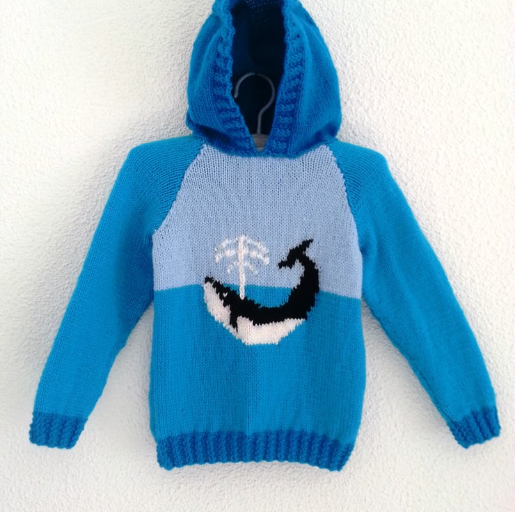 The sweater with hood features a Whale on the front and welts knitted in a twisted rib. Three shades of double knitting (8 ply) blue yarn have been used together with small amounts of white and black for the whale.