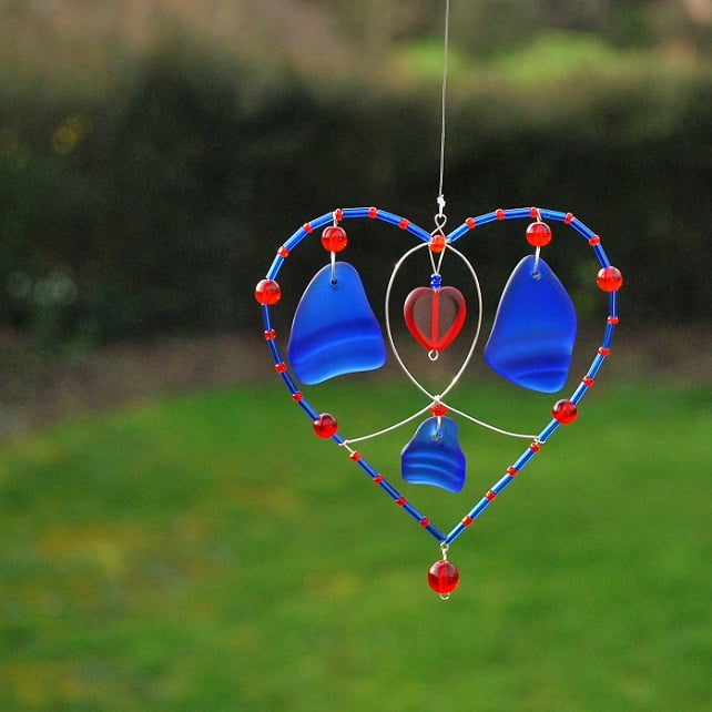 This is a gorgeous sun catcher made from pieces of old poison bottle neck and glass beads. The centre piece is a shiny glass heart which is frosted around the edges, and so goes perfectly with the tumbled glass which is matt, finely frosted and silky smooth. The pieces of bottle neck are all curved, so the sun catcher has some depth.