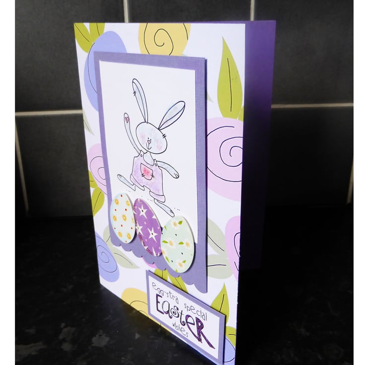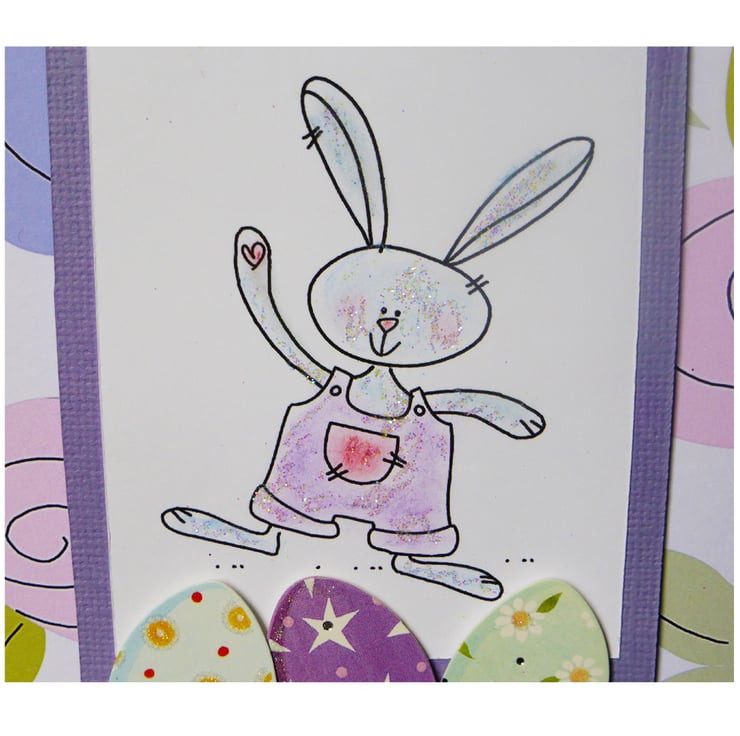Pretty Easter Card featuring stamped image of Easter Hare coloured in and glittered. This is matted onto pale lilac card, decorated with easter eggs and is raise-mounted onto patterned backing paper.