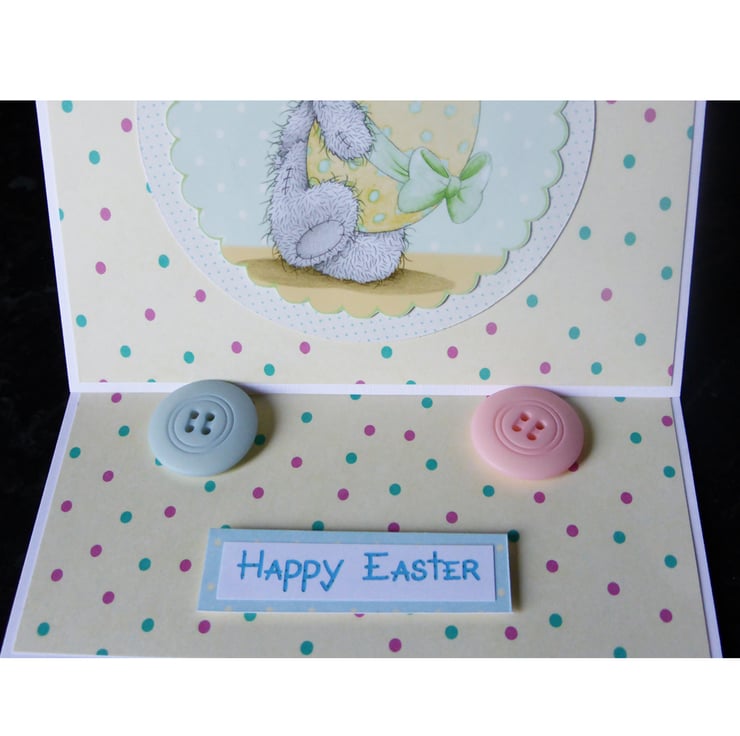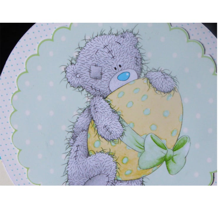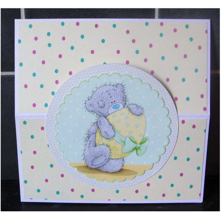 Tatty Teddy Easel Card. Image depicts Tatty carrying a huge yellow Easter egg. Pink and pale green button form Easel stop.