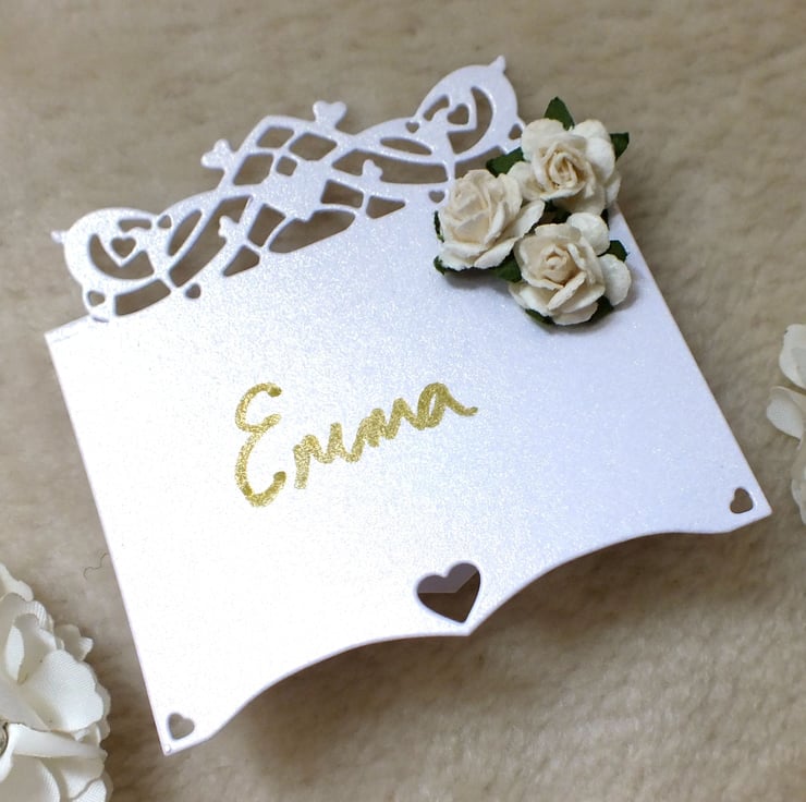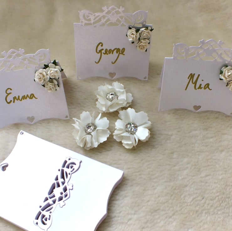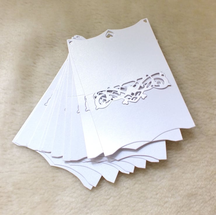 This listing is for a pack of 10, die-cut hearts flourish place cards, using premium quality centura card stock, which has a pearlescent finish. Suitable for any occasion, especially weddings.