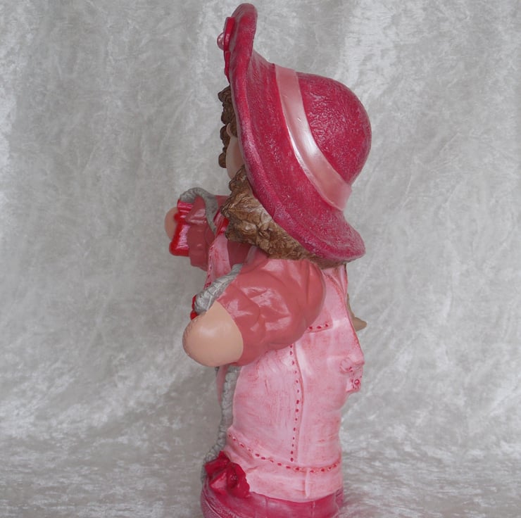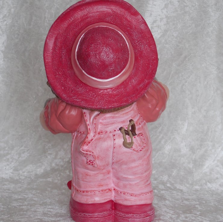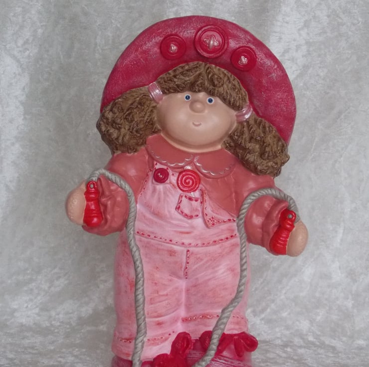 I have for sale a large ceramic standing girl figurine, which was hand painted by myself. She is dressed all in pink, playing with a skipping rope and a catapult in her back pocket. She is from a range called 'Button Buddies', due to the buttons on them. I have other different ones for sale in my shop. She would make a lovely addition on any child's bedroom shelf, or perhaps given as a gift.
