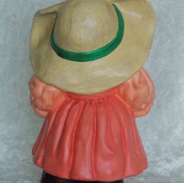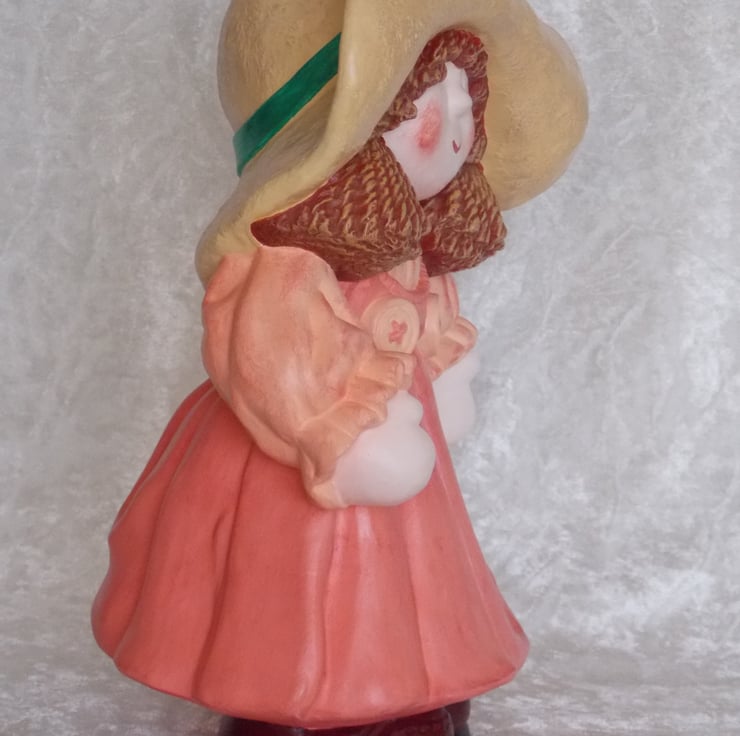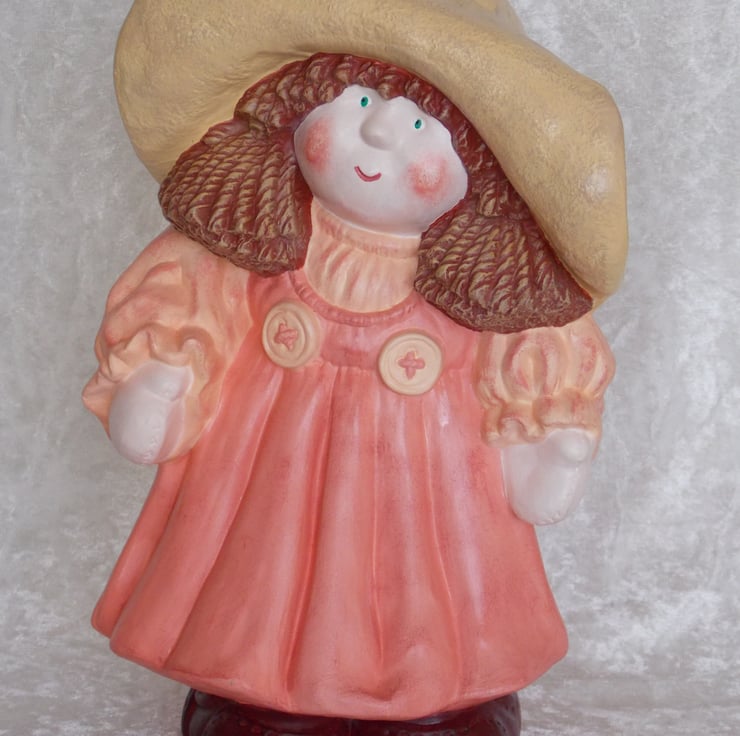 I have for sale a large standing ceramic girl figurine, which was hand painted by myself. She has a long peach dress and large floppy hat in a sandy colour, with a green band around it. She is from a range called 'Button Buddies', due to the buttons on them. I have other different ones for sale in my shop. She would make a lovely addition to any child's bedroom shelf, or perhaps given as a gift.
