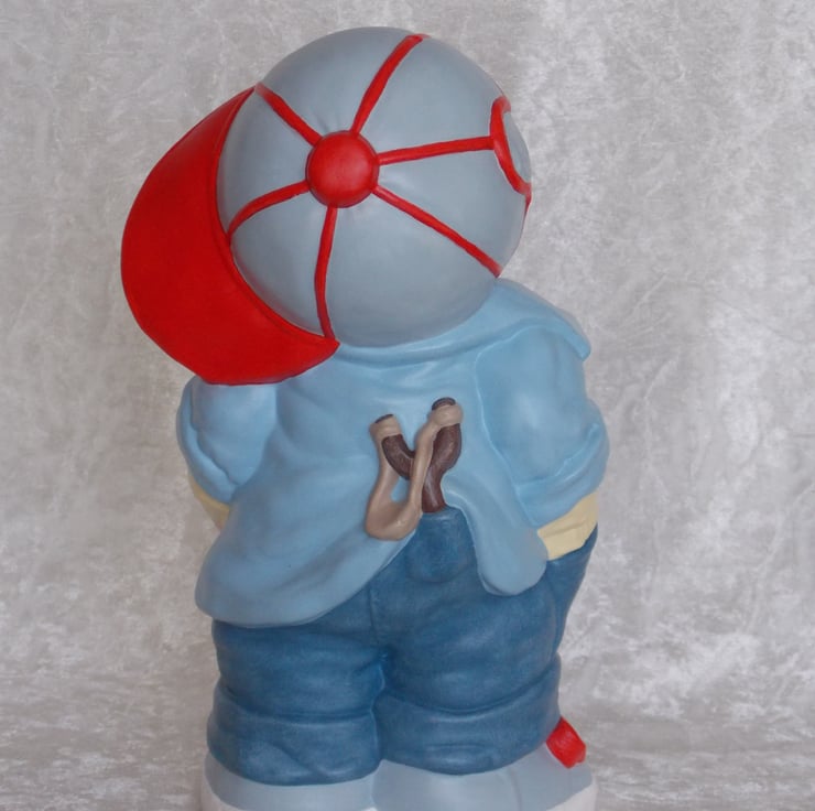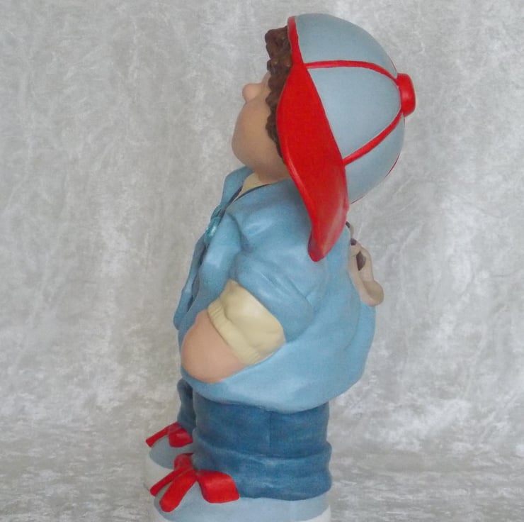 I have for sale a large ceramic standing boy figurine ornament, which was hand painted by myself. He is dressed in blue shirt and dungarees, with a red and blue baseball cap and shoes. He has a light coloured long sleeve top on, under his shirt and dungarees. Also, there is a catapult in his back pocket. He is from a range called 'Button Buddies', due to the buttons on them. I have other different ones in my shop. He would make a lovely addition to any child's bedroom shelf, or perhaps given as a gift.
