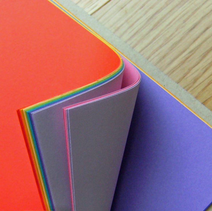 The book contains 32 pages (64 sides) of paper, four each of eight different bright shades, arranged in a rainbow.