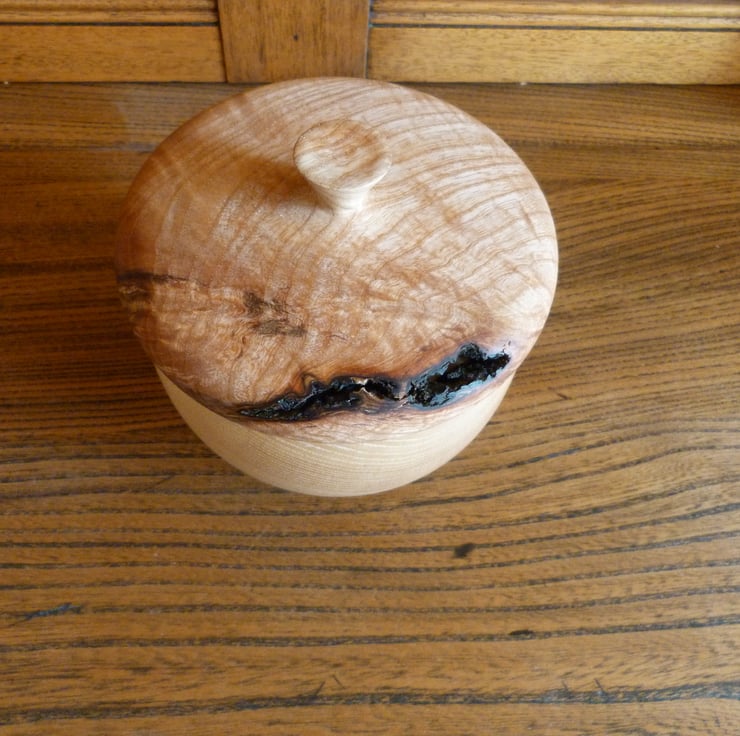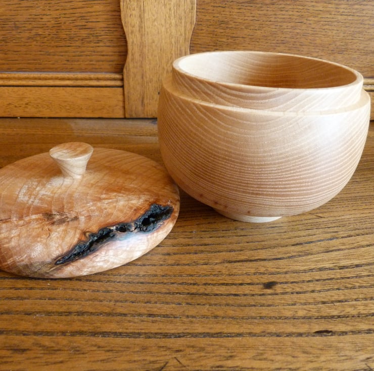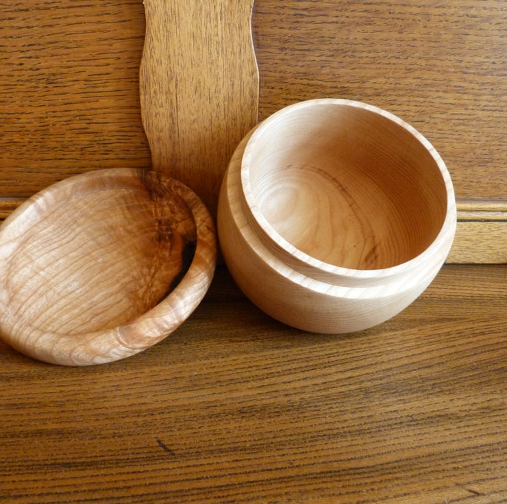 Lath turned box-container, made of english ash and treated with food safe for many uses in the kitchen, 5'' wide--5'' high.