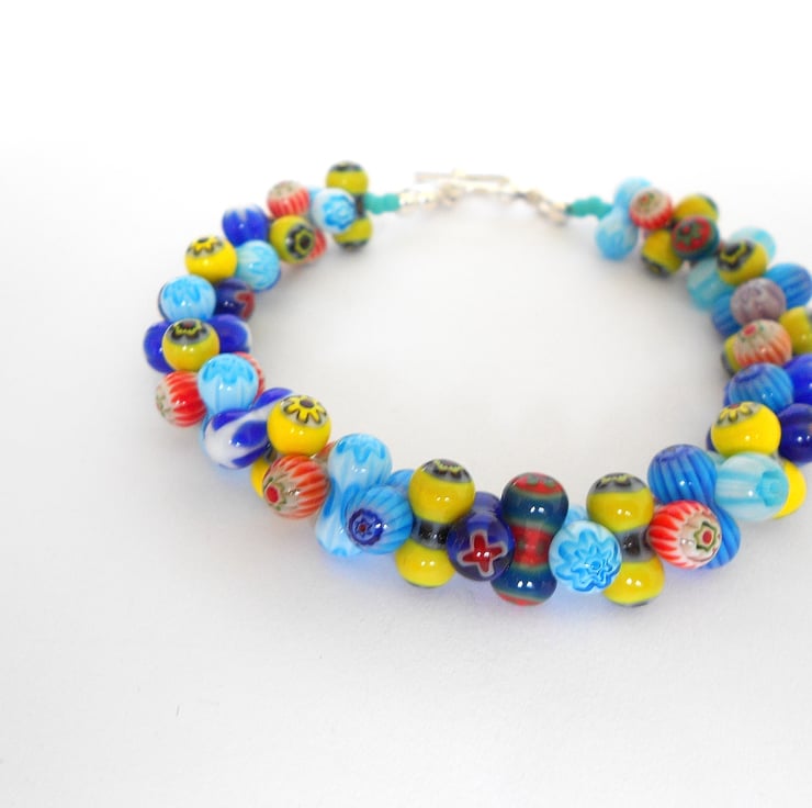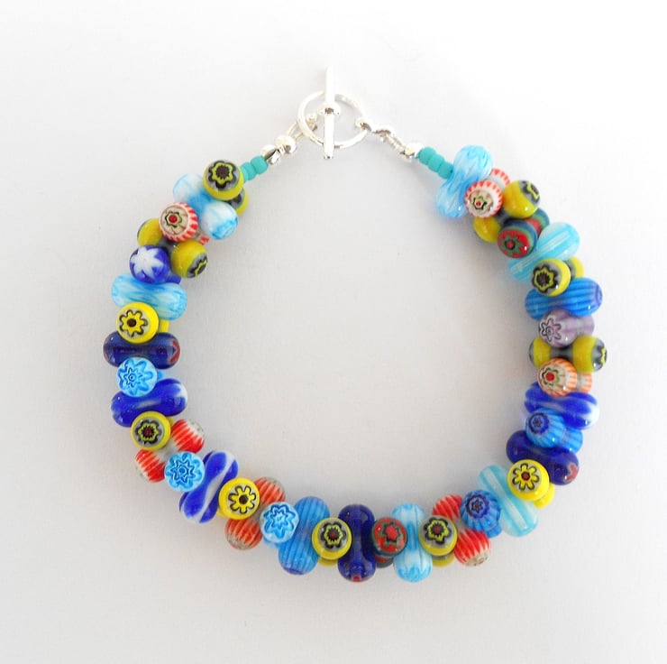 This is a lovely bracelet made from millefiori beads (italian for 'many flowers'). They are shaped like peanuts and fit into each other giving their distinctive look. As you can see, there are many colours including, turquoise, yellow, navy blue, royal blue, red and green. The bracelet measures 21cm (just over 8") If you require a different size, please contact me. The bracelet is finished with a silver toggle clasp. As all of the items in my shop are individual pieces made by myself, this is the bracelet you will receive. It will arrive gift wrapped in tissue paper and a organza bag.