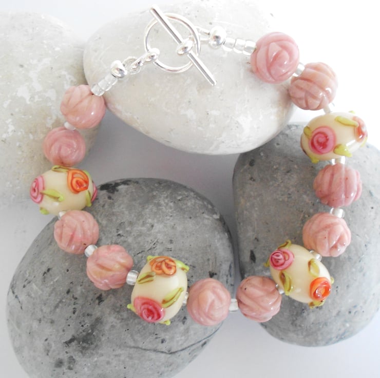 This is a lovely bracelet made from 10mm round carved rhodonite beads which are interspersed with cream lampwork beads with pink roses on them. The bracelet is really pretty and unusual, it measures 20cm (8") and is finished with a silver toggle clasp. As all of the items in my shop are individual pieces made by myself, this is the bracelet you will receive. It will arrive gift wrapped in tissue paper and a organza bag.
