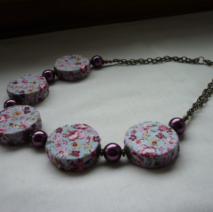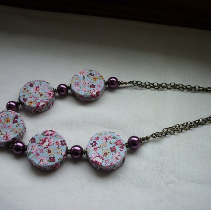 THE NECKLACE HAS BEEN MADE WITH FIVE 33 X 11 MM ACRYLIC TABLET SHAPED BEADS COVERED IN A DUCK EGG AND MULTI COLOURED FLORAL DESIGN FABRIC ALONG WITH WINE COLOURED 12MM PEARLS, ANTIQUE BRONZE DAISY SPACER BEADS, ANTIQUE BRONZE BEAD CAPS AND FINISHED WITH ANTIQUE BRONZE TRACE CHAIN, LOBSTER CLASP AND FINDINGS.