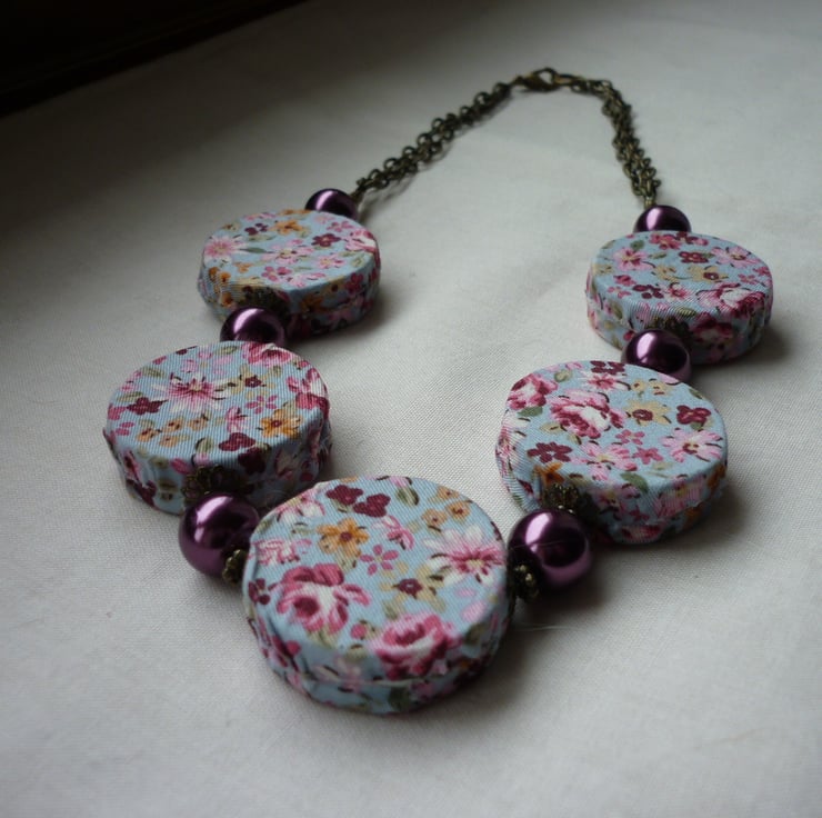 THE NECKLACE HAS BEEN MADE WITH FIVE 33 X 11 MM ACRYLIC TABLET SHAPED BEADS COVERED IN A DUCK EGG AND MULTI COLOURED FLORAL DESIGN FABRIC ALONG WITH WINE COLOURED 12MM PEARLS, ANTIQUE BRONZE DAISY SPACER BEADS, ANTIQUE BRONZE BEAD CAPS AND FINISHED WITH ANTIQUE BRONZE TRACE CHAIN, LOBSTER CLASP AND FINDINGS.