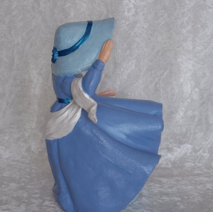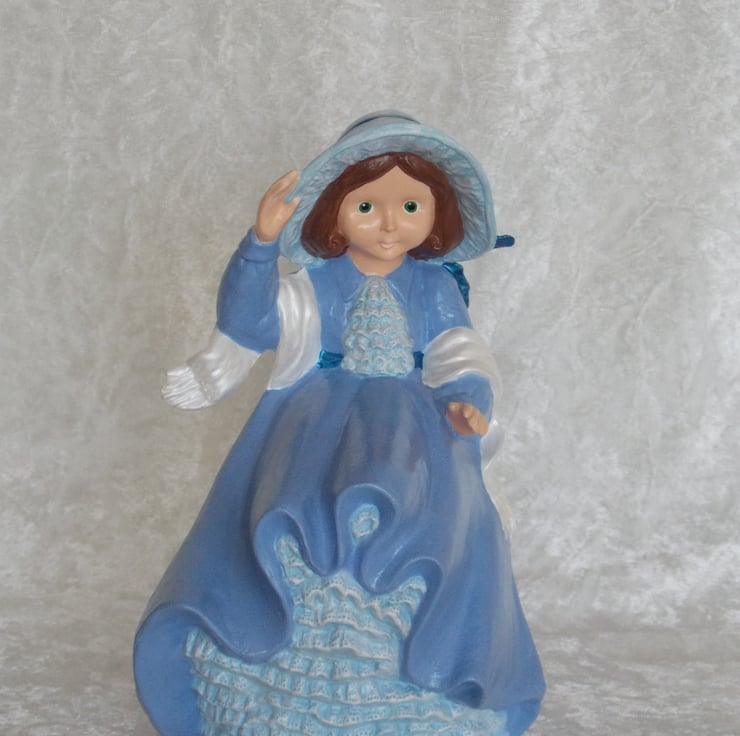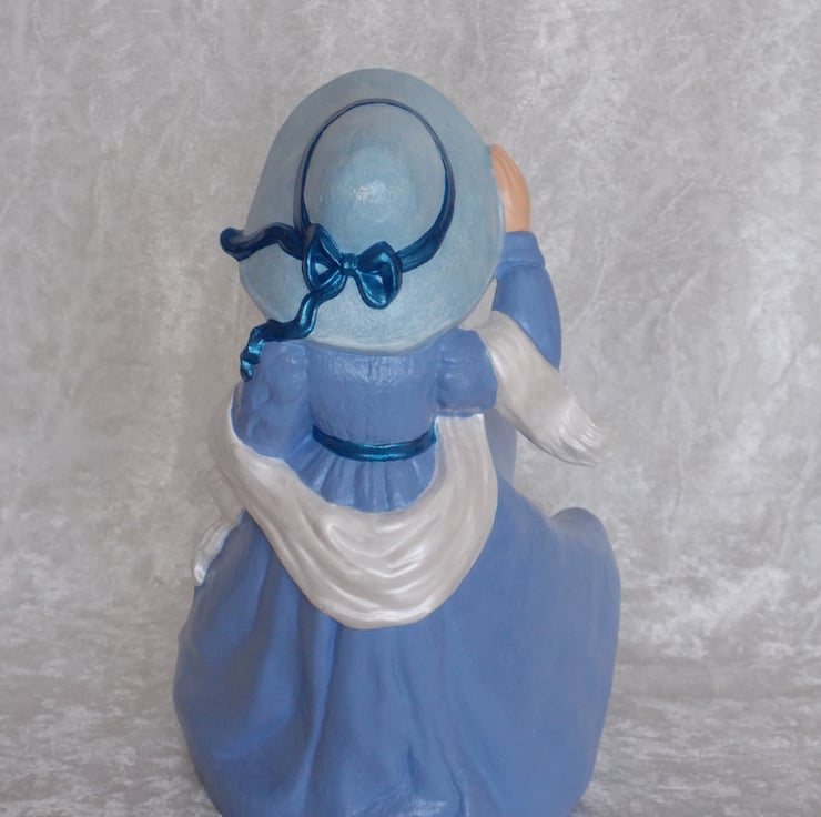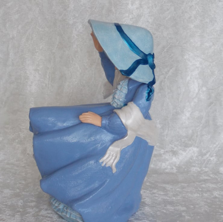 I have for sale a very pretty free standing figurine ornament, which was hand painted by myself. She is dressed in a long blue dress and blue bonnet, with a white shawl. She would make a lovely addition to anyone's home, or perhaps given as a gift.