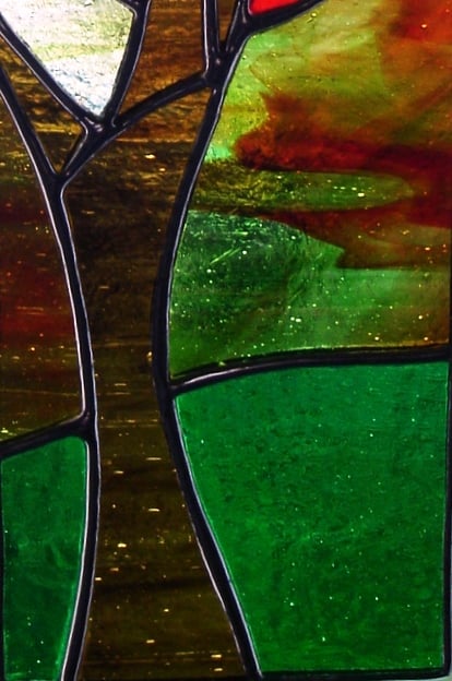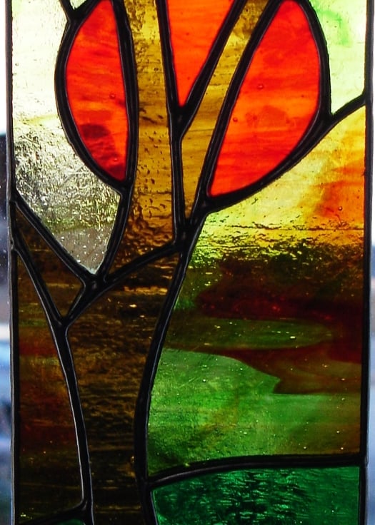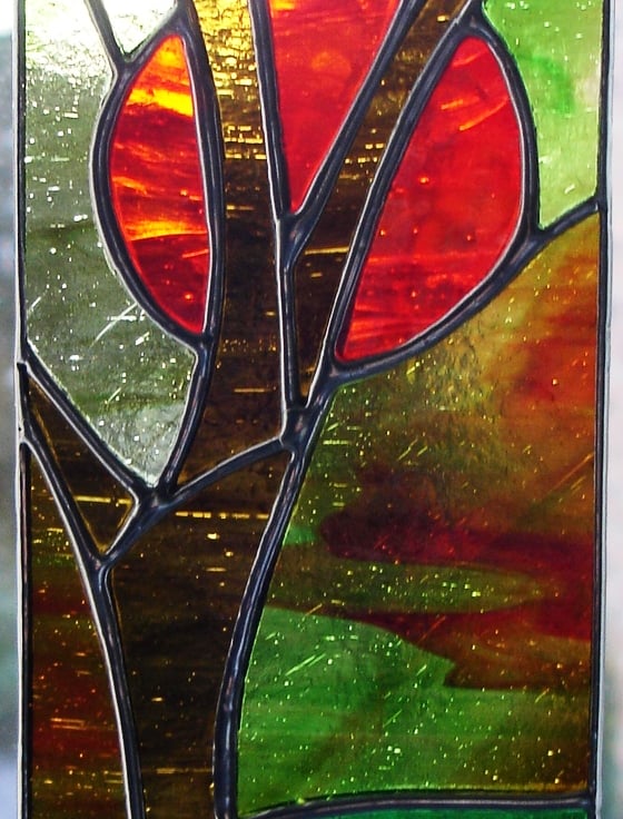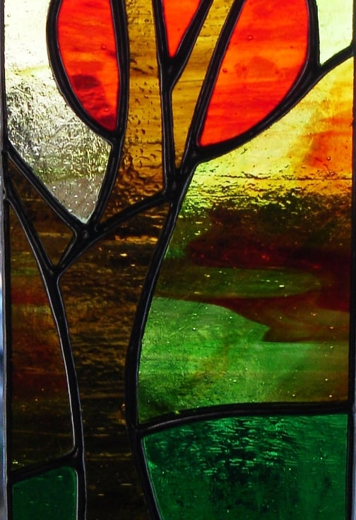 Sunset Through the Trees is a very atmospheric panel and I have used streaky brown and green glasses to create a soft woodland tone which contrasts well with the deep red of the sun. It is entirely hand-crafted using the Tiffany method of stained glass making. I have attached a chain so the panel is ready to hang in a window or wherever the light will flow through it. A lovely gift for all occasions.