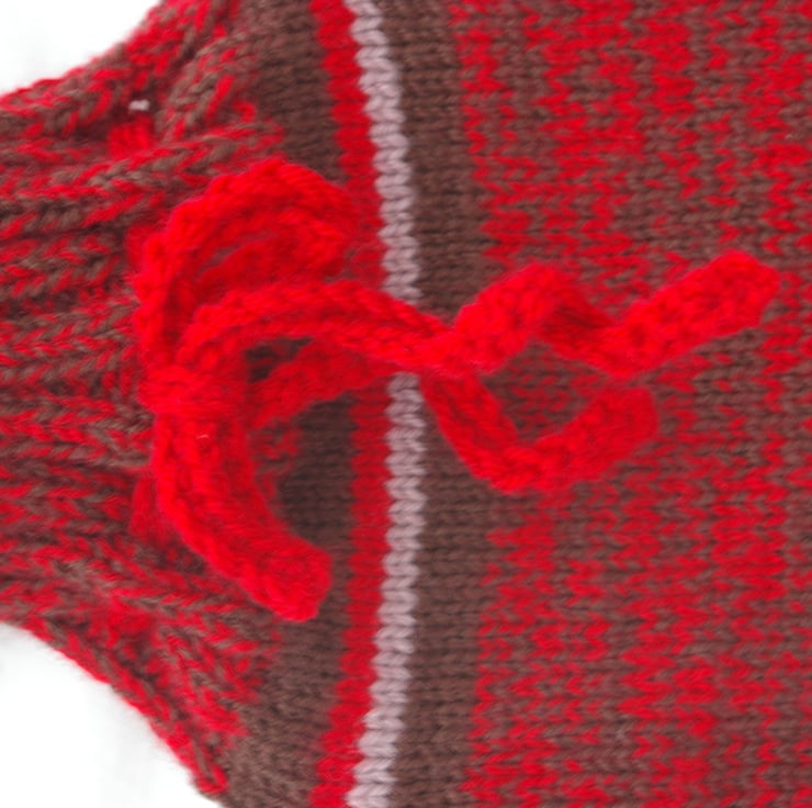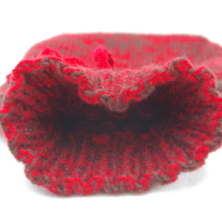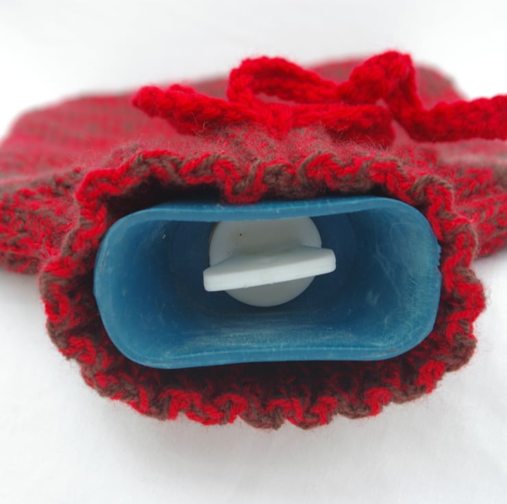 A hand knitted Hot Water Bottle Cover. This cover has been lovingly knitted in browns and reds. The majority of the case is knitted with two yarns, a brown and red, in order to produce a ‘mottled’ effect. Just, before the neck of the cover there are a series of stripes in dark brown, light brown and red. The mottled brown and red effect is then repeated for the gathered neck of the cover. The neck opens up to receive a standard sized hot water bottle and fastens with a red hand crochet draw string.