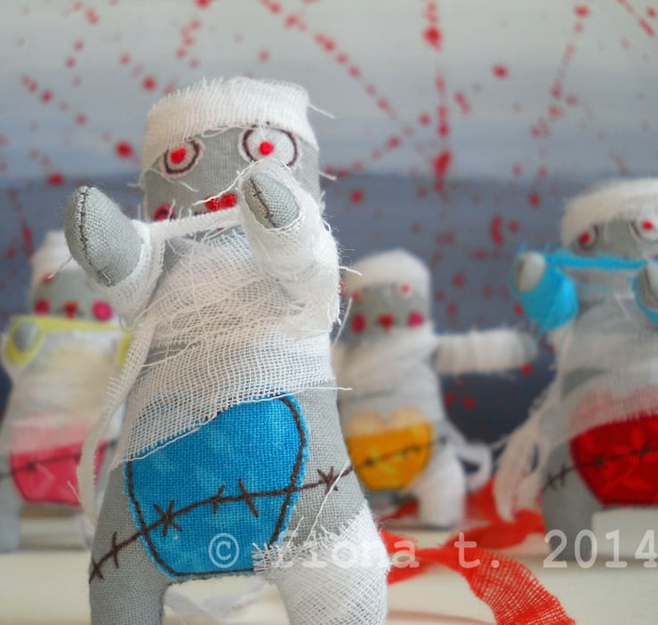 due to the unpredictable nature of hand dyed fabrics, free machine embroidery and zombie mummies, each item will vary.