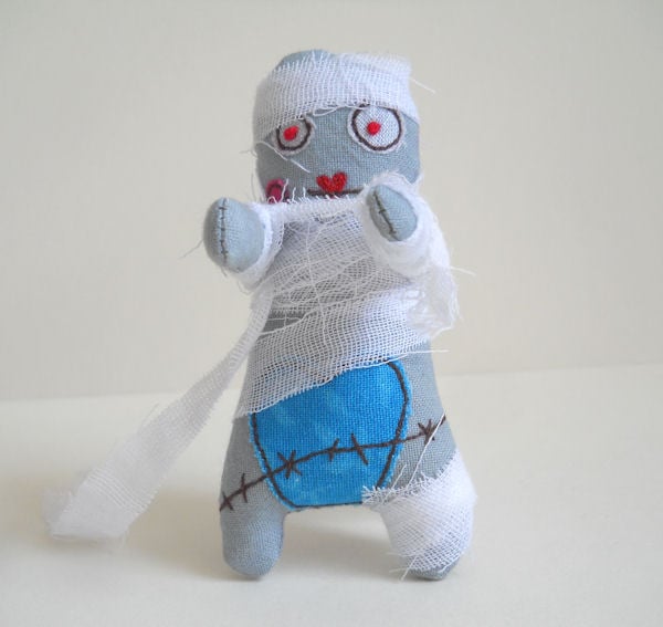 mummy is hand dyed a unique shade of corpse blue. she’s beautifully made up for her special day, with pink cheeks and red lipstick. she has a big blue heart on her tummy, & her eyeballs are hand embroidered.