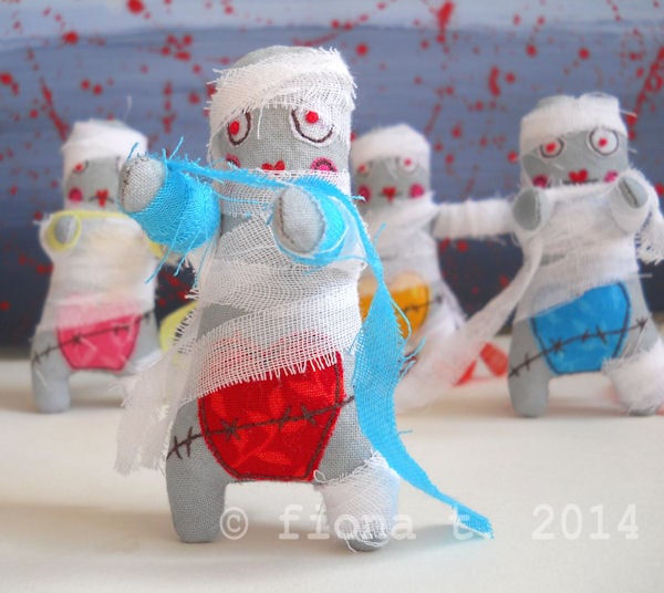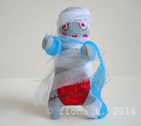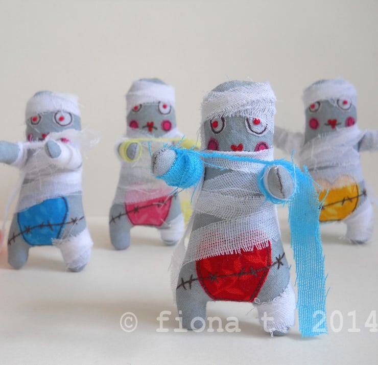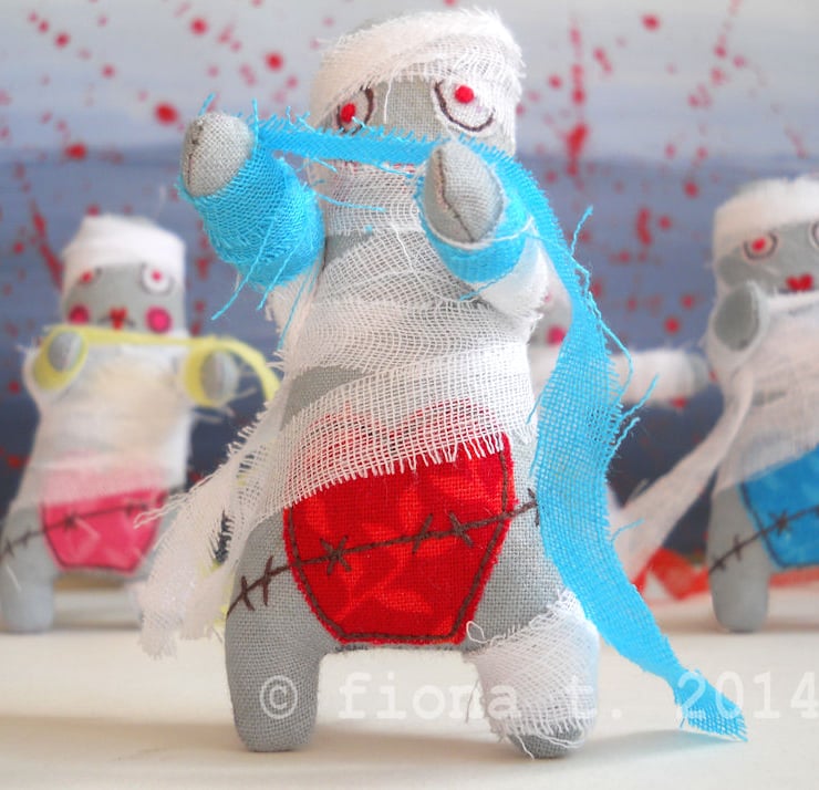 due to the unpredictable nature of hand dyed fabrics, free machine embroidery and zombie mummies, each item will vary.
