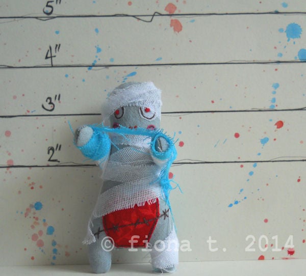 mummy is hand dyed a unique shade of corpse blue. she’s beautifully made up for her special day, with pink cheeks and red lipstick. she has a big red heart on her tummy, & her eyeballs are hand embroidered.