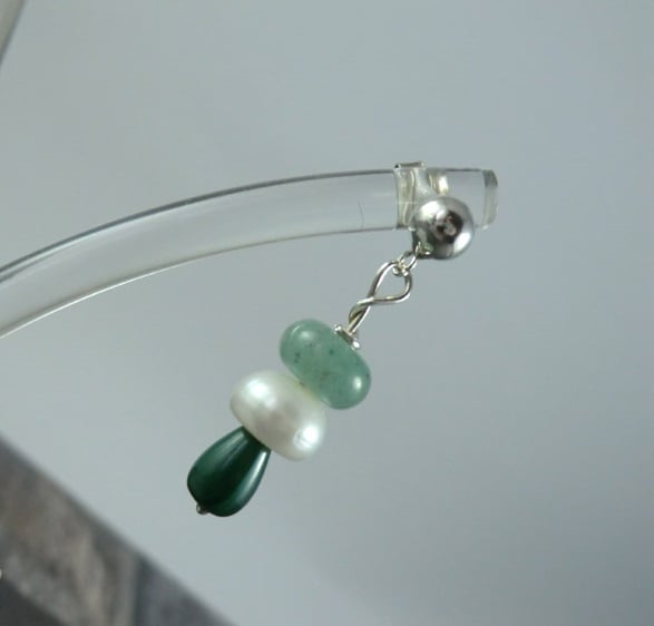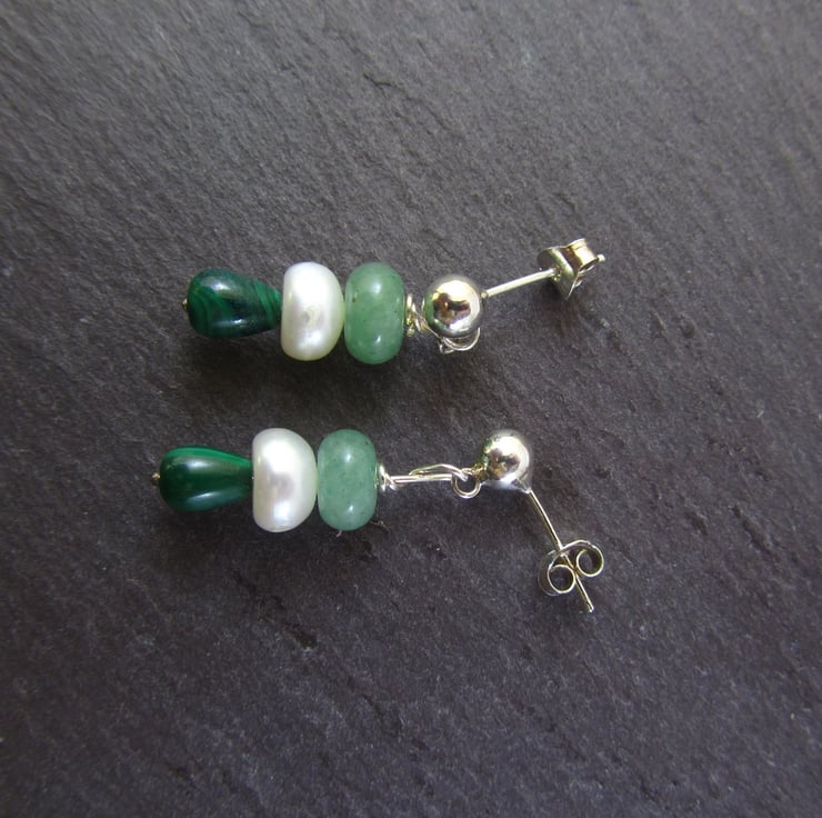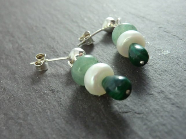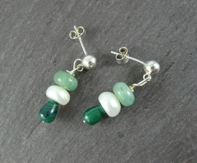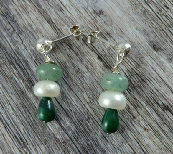 This is a beautiful pair of green malachite pearl earrings. They are created with real white pearls, real prehnite gemstones, real malachite gemstones and silver. These delicate earrings are great for either everyday wear or for that special occasion.