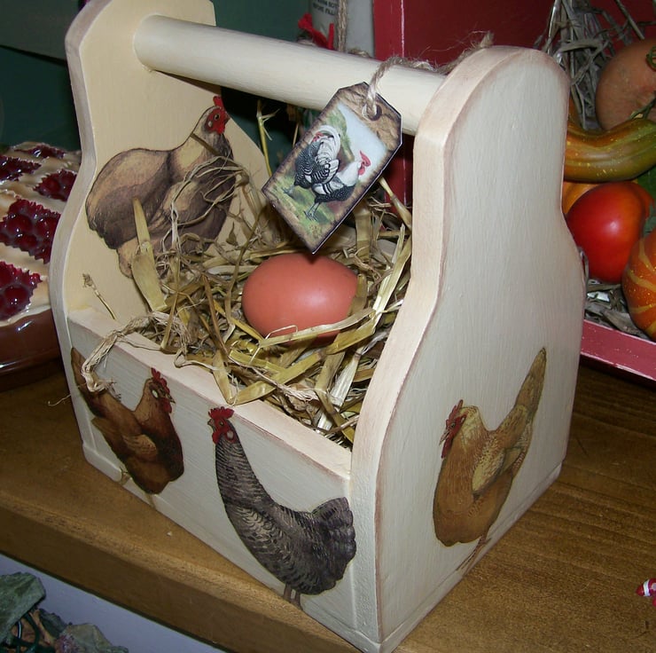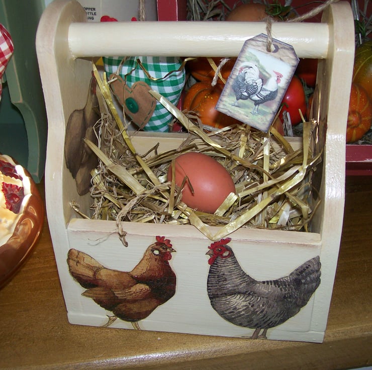HANDCRAFTED WOODEN EGG STORAGE BOX MADE USING EMMA BRIDGEWATER CHICKENS KITCHEN