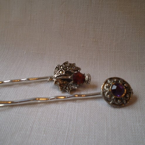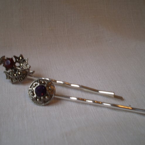 Steampunk recyling at it's best. Two Celtic style hair pins, one thistle, one sheild design. Created from Vintage earrings, beautiful amber and purple glass centres surrounded my marcasite.. Keep one and give the other as a gift. Perfect for a special occasion or just to add sparkle to your hair.