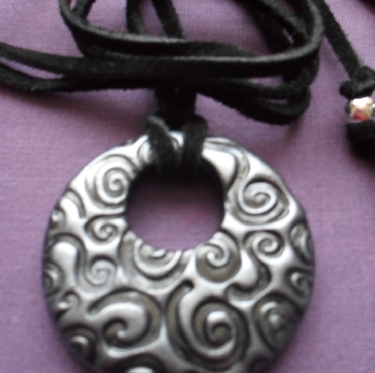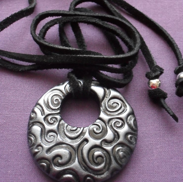 Black polymer clay which has a textured pattern, and a silver tone applied with mica powder which gives a metallic finish. Pendant has a polymer clay glaze and attached to a suede cord with two silver plated beads at the end of each of the cords.