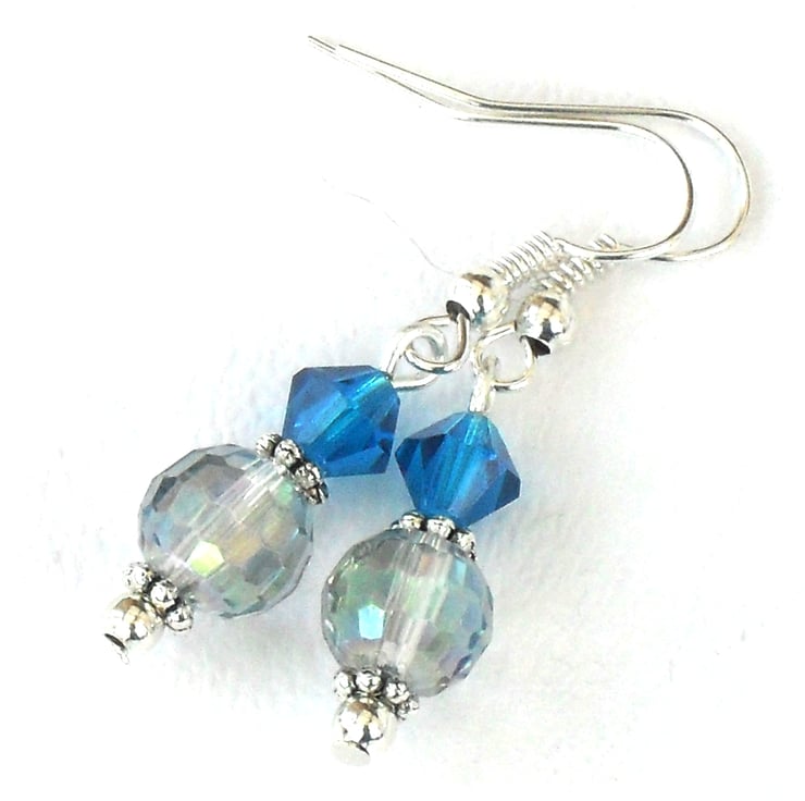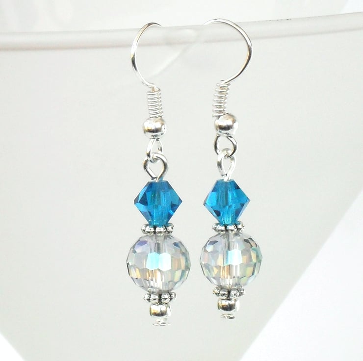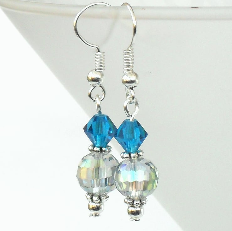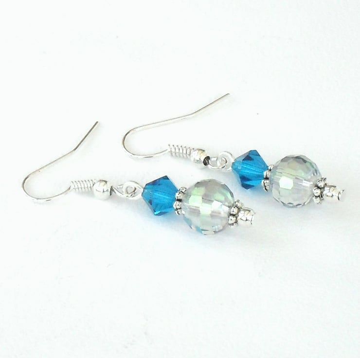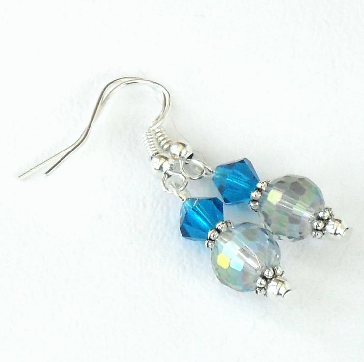 The smaller crystal is a vivid blue bicone that looks great with the larger crystal and silver coloured spacer beads.