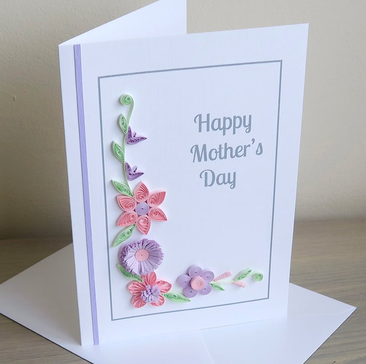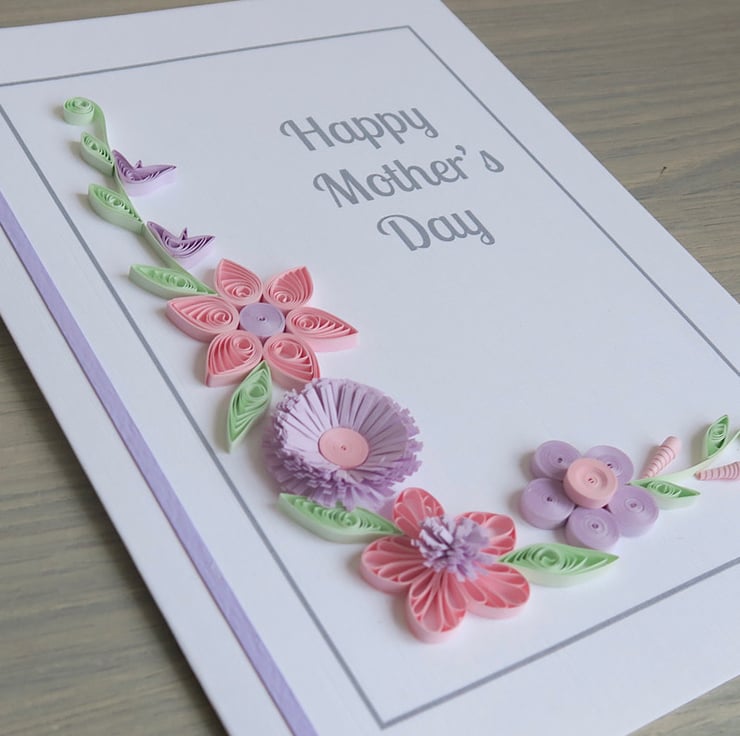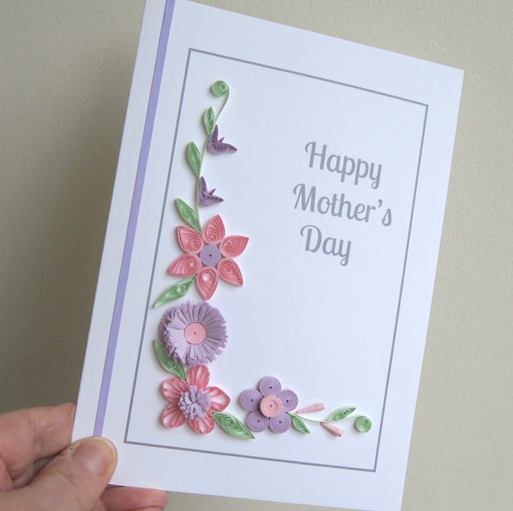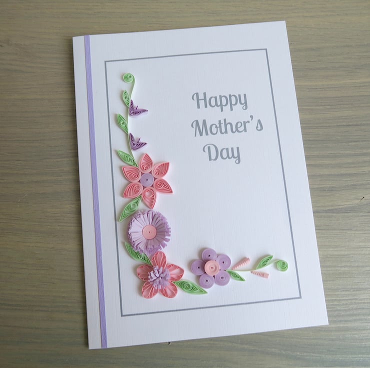 A beautiful quilled Mother's day card with quilling flowers in pretty shades of pink and lilac to show your mum how much she is loved.