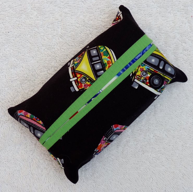 Travel Tissue Holder in Black VW camper Print Cotton Fabric. Green Trim.