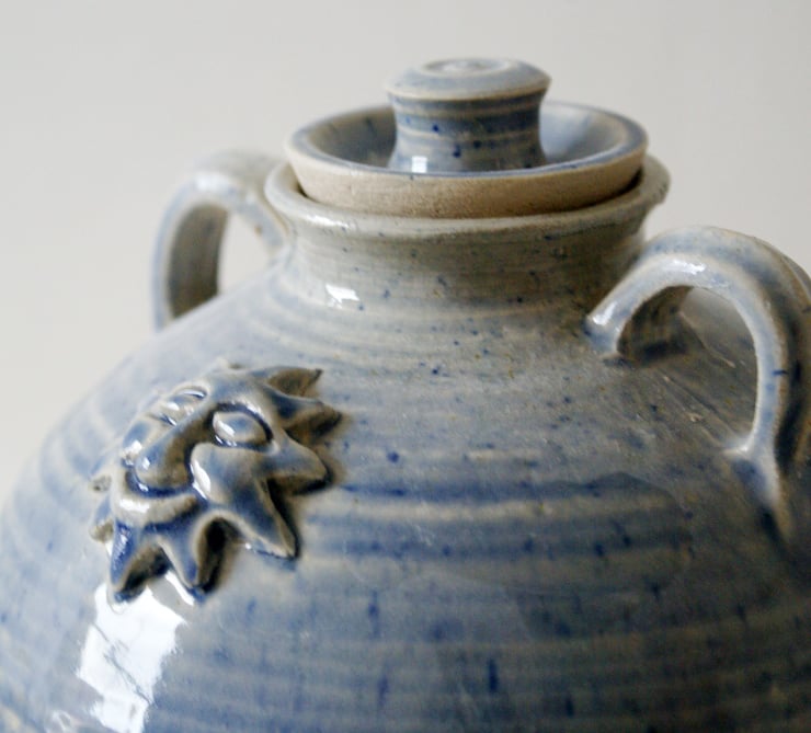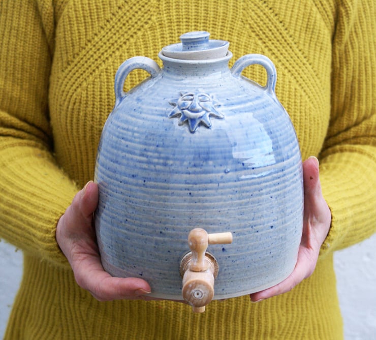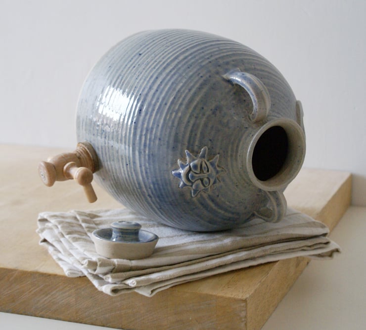 The large barrel body was thrown by hand on the wheel and features two small lug handles for carrying it around. A small narrow lid on the top allows liquids to be poured in at the top and a small tap on the bottom provides a pour.