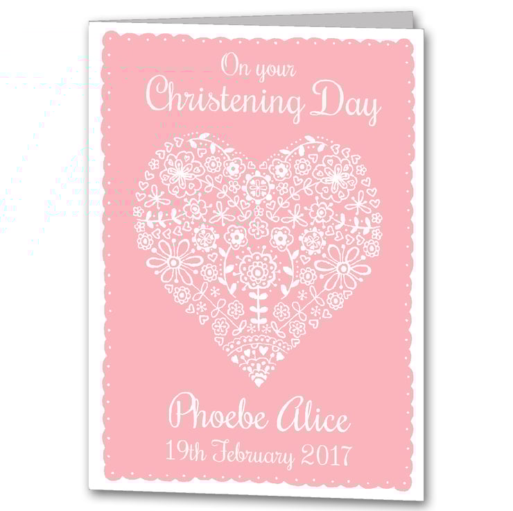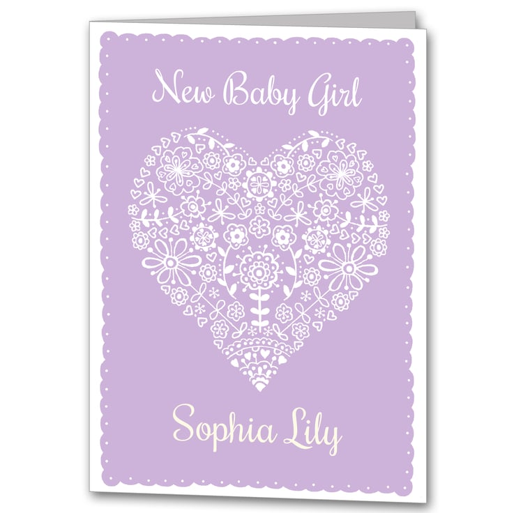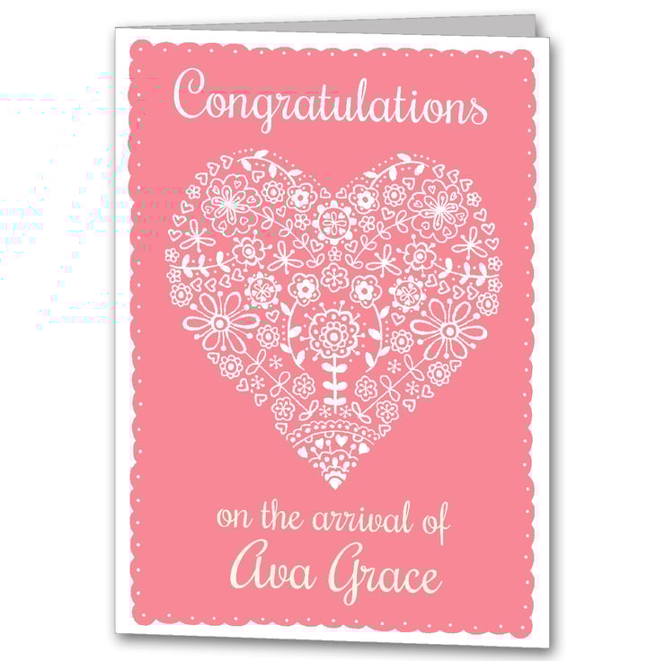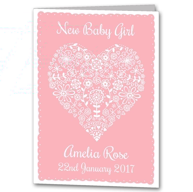 This personalised new baby card features a pretty folk inspired heart as well as the new baby girl's name. It is truly special because you can let me know the message you would like on the front, making it a really thoughtful card that the baby's family will love.