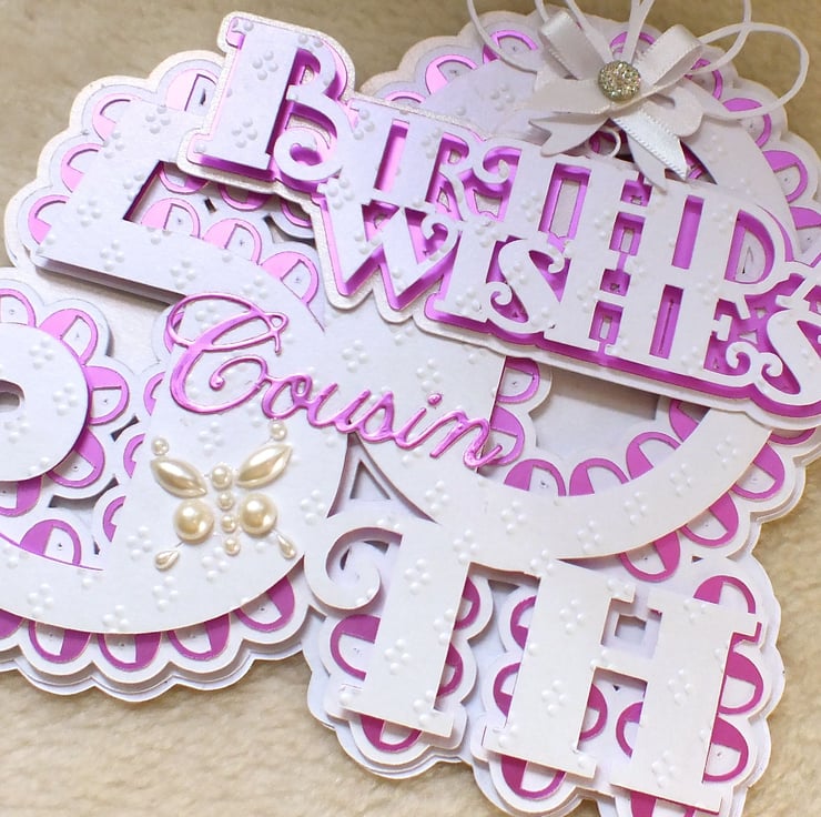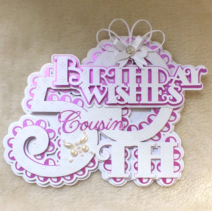 This pretty handmade 50th birthday numeric word shaped card is perfect for that special birthday. The white layers are premium quality centura card stock which has a pearlised finish, layered with pink satin card, and top layer embossed with elegant dainty dots, embellished with an exquisite faux gem on a satin bow, plus pearl butterfly. The card includes the sentiment 'Happy 50th Birthday' inside, and is approx. 8”x6.5” in size.