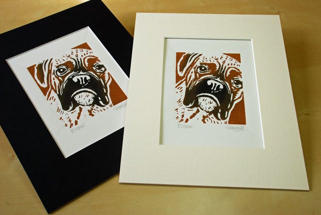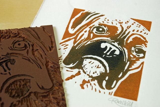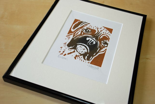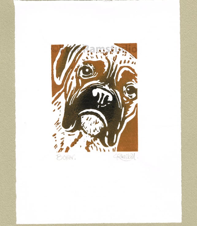 'Boxer Dog' - Original, hand printed linocut, printed on hand press in black and tan ink.