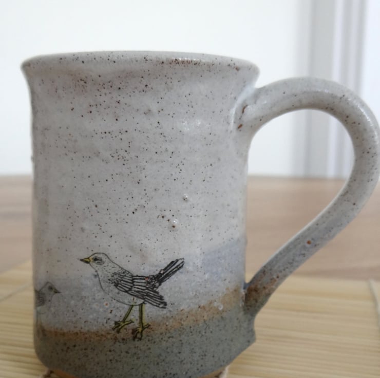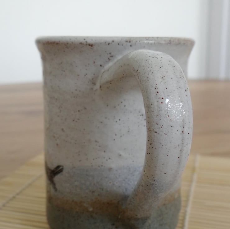 Glazed in shades of white and blue reminiscent of sea, sand and sky and finished with 3 starlings around its base, the mug is made of strong stoneware clay with a high iron content which produces burnt orange shading especially along the rim and throwing rings. Slight unevenness of glaze and/or form is evidence that the mug is handmade and adds to its rustic charm.