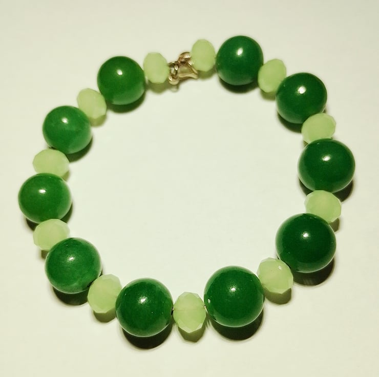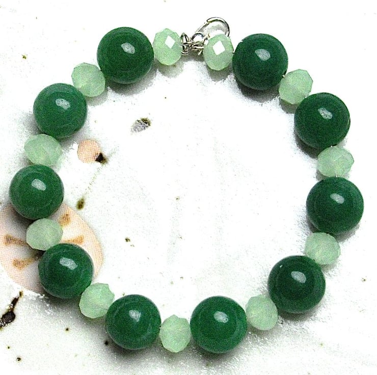 This lovely bracelet is made from round green aventurine gemstone and faceted pale green crystal beads strung on memory wire with a silver plated lobster catch.