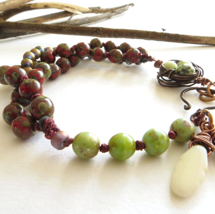 This birds nest bracelet is so full of detail - a tiny wire birds nest containing three speckled eggs, plaited strands of beads, a handmade hook clasp and wire wrapped glass feathers! The colours range from deep red beads with a picasso finish, to bronzy green seed beads, knotted onto linen cord. This bracelet would be lovely for autumn, or any time of year, for those who like something a bit different, and it would make a fantastic gift for any nature lover.