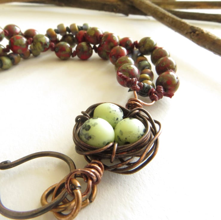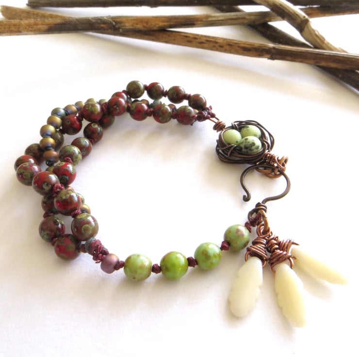 This birds nest bracelet is so full of detail - a tiny wire birds nest containing three speckled eggs, plaited strands of beads, a handmade hook clasp and wire wrapped glass feathers! The colours range from deep red beads with a picasso finish, to bronzy green seed beads, knotted onto linen cord. This bracelet would be lovely for autumn, or any time of year, for those who like something a bit different, and it would make a fantastic gift for any nature lover.